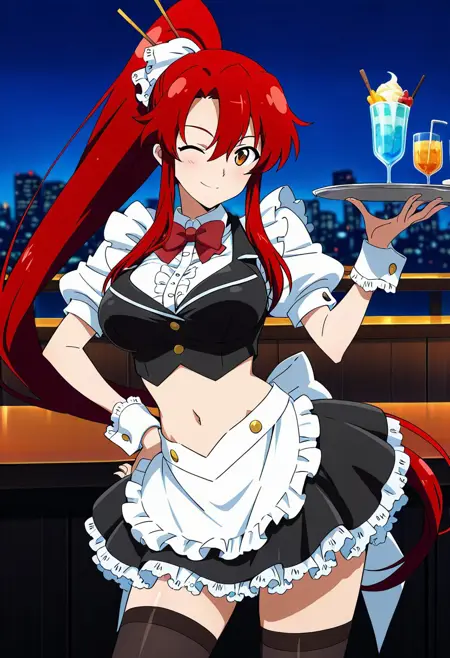 YokoWaitress, 1girl, solo, very long hair, sidelocks, red hair, hair between eyes, amber eyes, large breasts, curvy, wide hips, navel, midriff, crop top, frills, hair stick, hair ornament, apron, white waist apron, miniskirt, waitress, frilled skirt, ponytail, white ribbon on hair, puffy sleeves, wrist cuffs, short sleeves, zettai ryouiki, puffy short sleeves, frilled apron, high ponytail, black vest, black skirt, red ribbon at back waist ribbon, black thighhighs, high heels, black shoes,