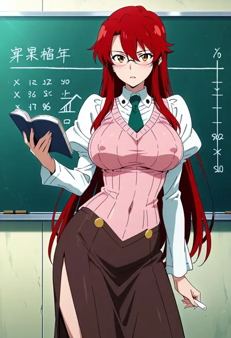 YokoMissYomako, 1girl, solo, very long hair, sidelocks, red hair, hair between eyes, amber eyes, large breasts, curvy, wide hips, covered navel, covered nipples, glasses, green necktie, hair down, long sleeves, teacher, brown long skirt, juliet sleeves, puffy sleeves, side slit, alternate hairstyle, aged up, white shirt, pink sweater, red shoes,