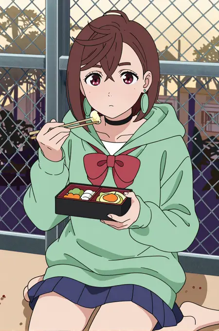 2. Ayase Momo from Dandadan, 1girl, earrings, solo, jewelry, bento, brown hair, red eyes, choker, hood, skirt, eating, food, chopsticks, looking at viewer, hoodie, sitting, black choker, green hoodie, bow, holding, pleated skirt, fence, holding chopsticks, chain-link fence.