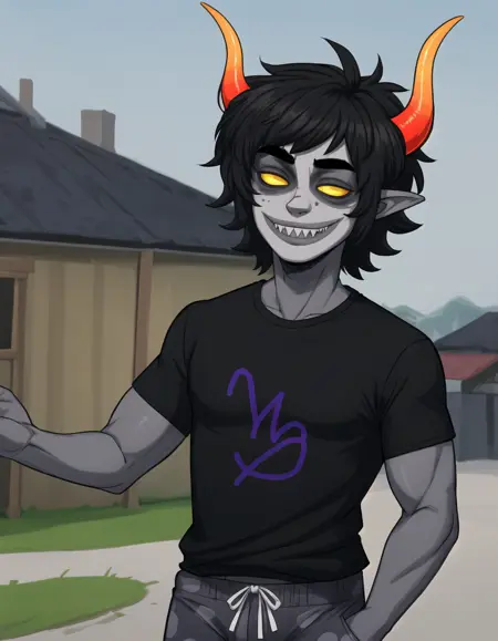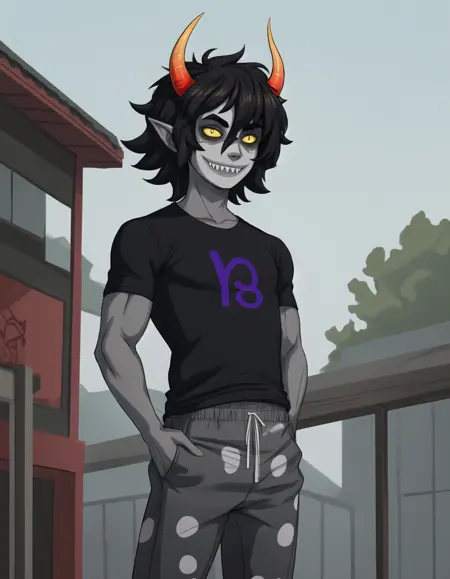 関連プロンプト:黒髪、角、オレンジ色の角、色付き肌、灰色の肌、黄色の眼球、鋭い歯、笑顔、黒シャツ、Tシャツ、ドット柄パンツ