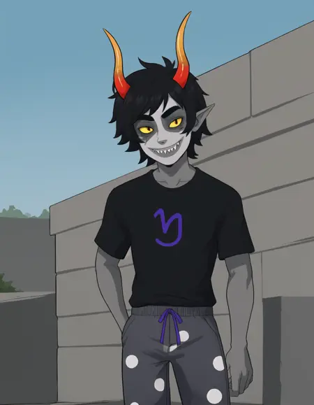 有用なプロンプト:solo, 1boy, male focus, black hair, horns, orange horns, colored skin, grey skin, yellow sclera, sharp teeth, smile, black shirt, t-shirt, polka dot pants