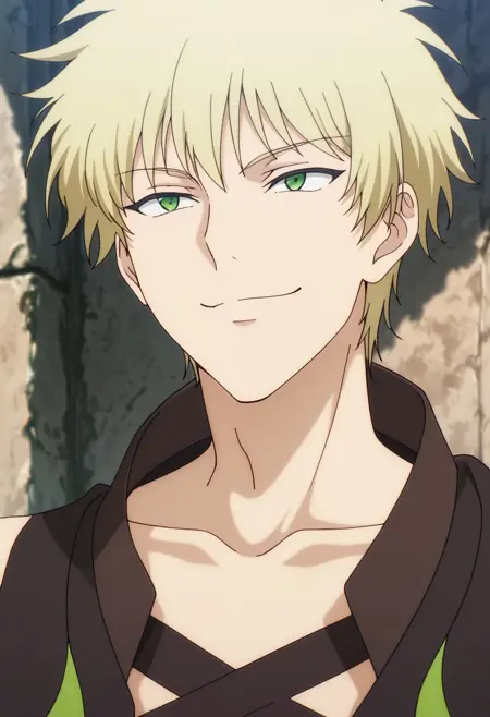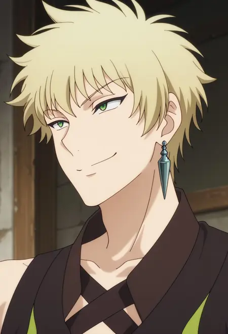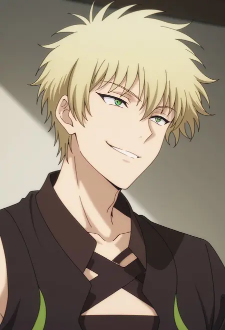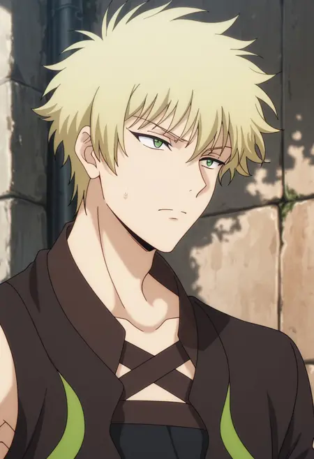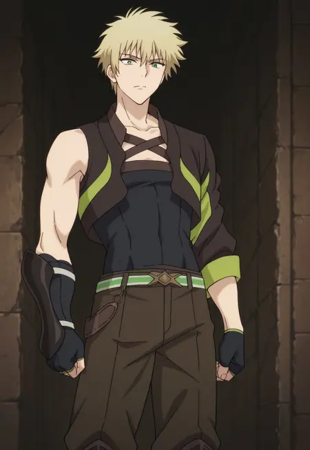 1boy, male focus, solo, green eyes, blonde hair, single earring, collarbone, black shirt, brown jacket, single sleeve, cropped jacket, black gloves, fingerless gloves, single arm guard, belt, brown pants, boots,