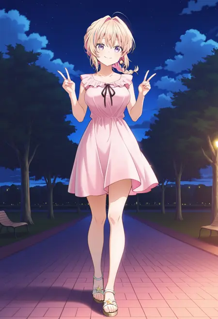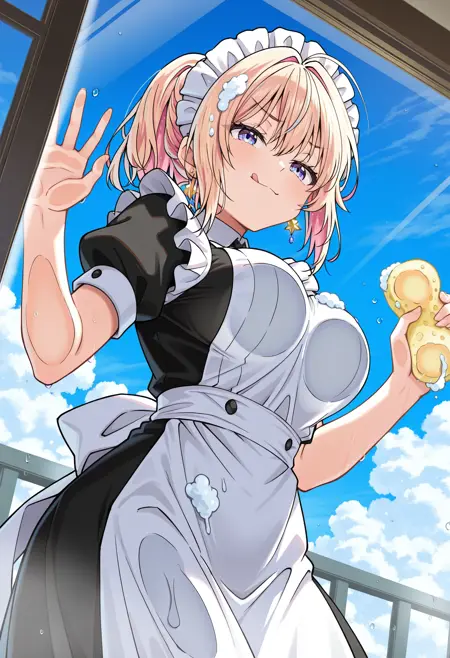 1girl, purple eyes, bangs,sidelocs, star earrings, jewelry, mediub breasts, blonde hair, pink hair, multicolored hair,