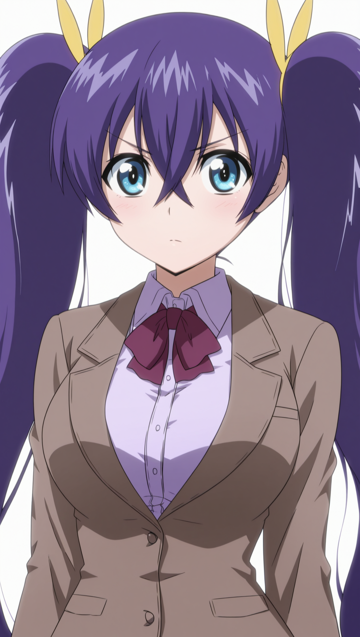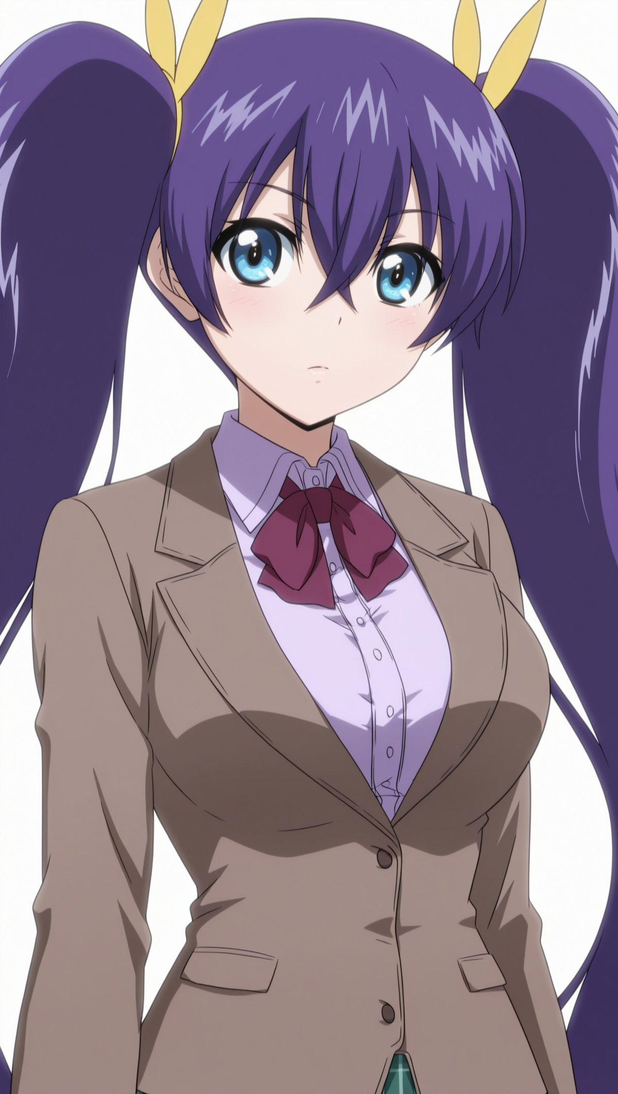 anime coloring, masterpiece, best quality, amazing quality, takaokamisaki, 1girl, long hair, twintails, purple hair, blue eyes, medium breasts, hair ribbon, yellow ribbon, shirt, collared shirt, purple shirt, bowtie, jacket, brown jacket, skirt, plaid skirt, green skirt, solo, pose, standing, looking at viewer, from front, ((((white background, simple background))))