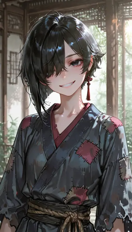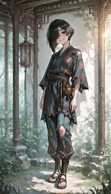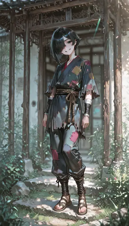 wuxia_dio, sandals, bandaged_arm, patchwork_clothes,