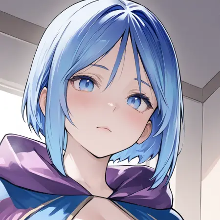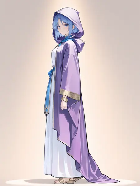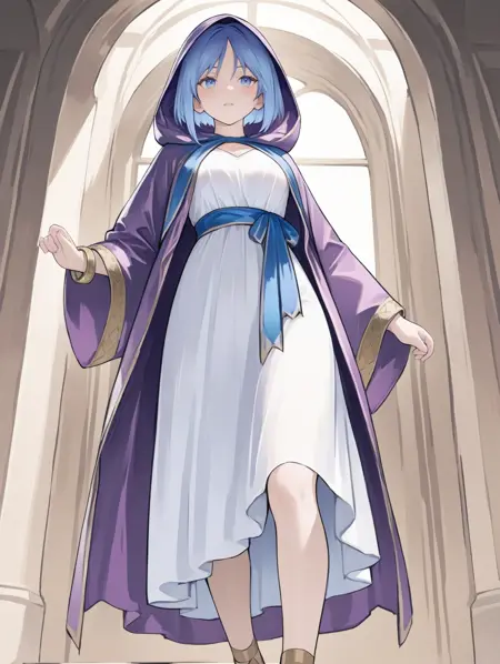 프롬프트 예시: firiarobu, 파란 눈, 파란 머리, 짧은 머리, 보라색 로브, 후드, 흰색 드레스, 파란 띠, 넓은 소매, 팔찌, 모래신발,