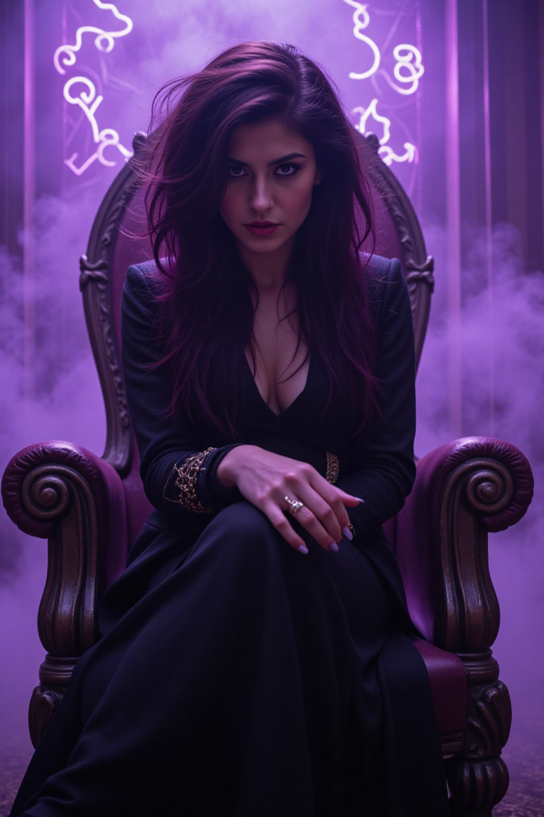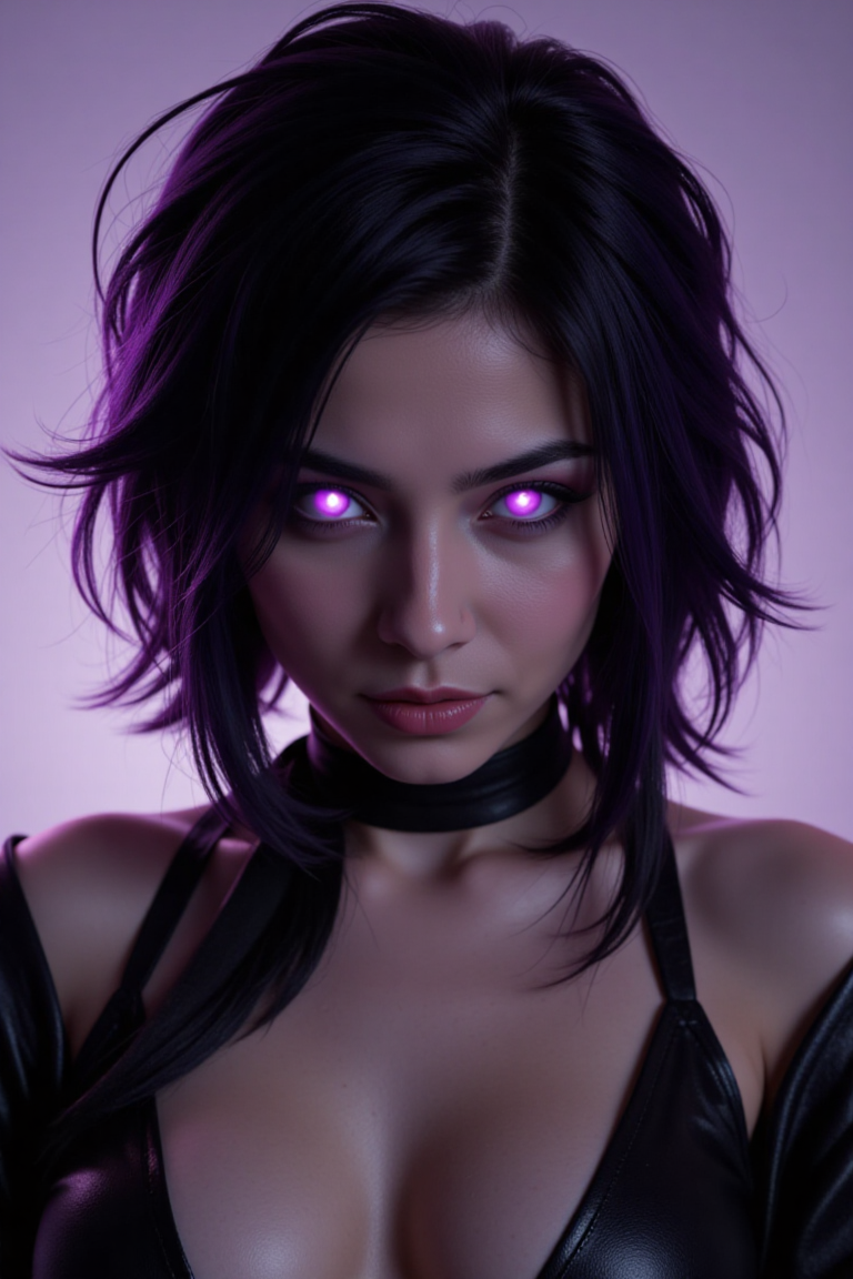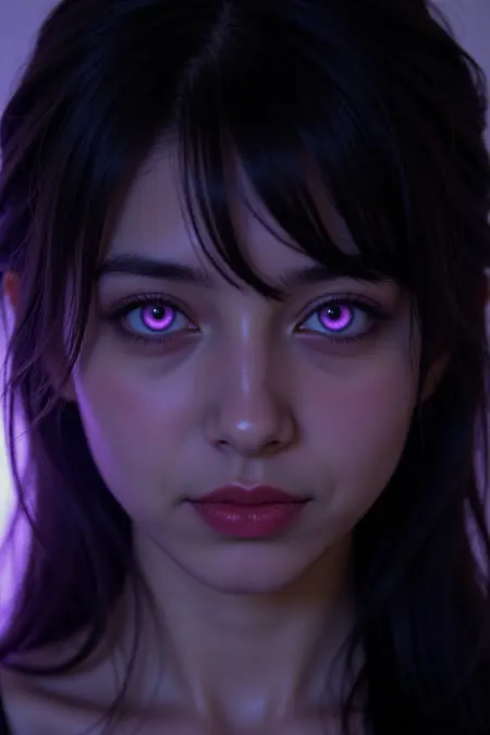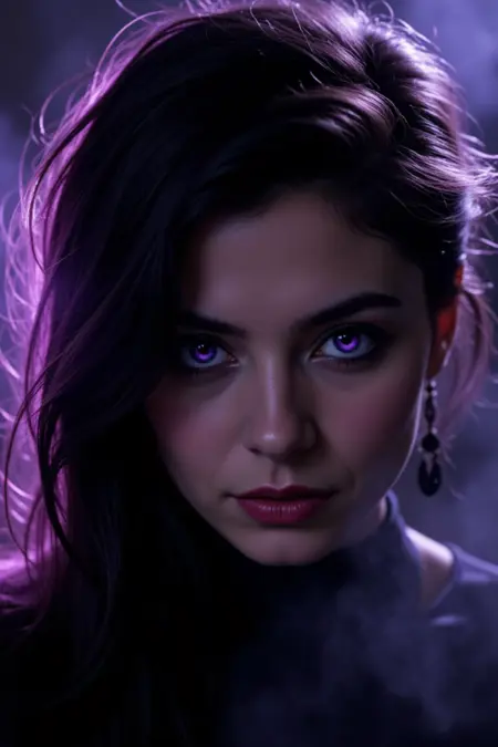 arcane-cine,超写实动漫电影风格的女战士肖像,发光的紫色眼睛,锐利的风格化面部,戏剧性的轮廓光,绘画式阴影,情感丰富的表情,体积氛围,超精细发丝,8K 电影级渲染