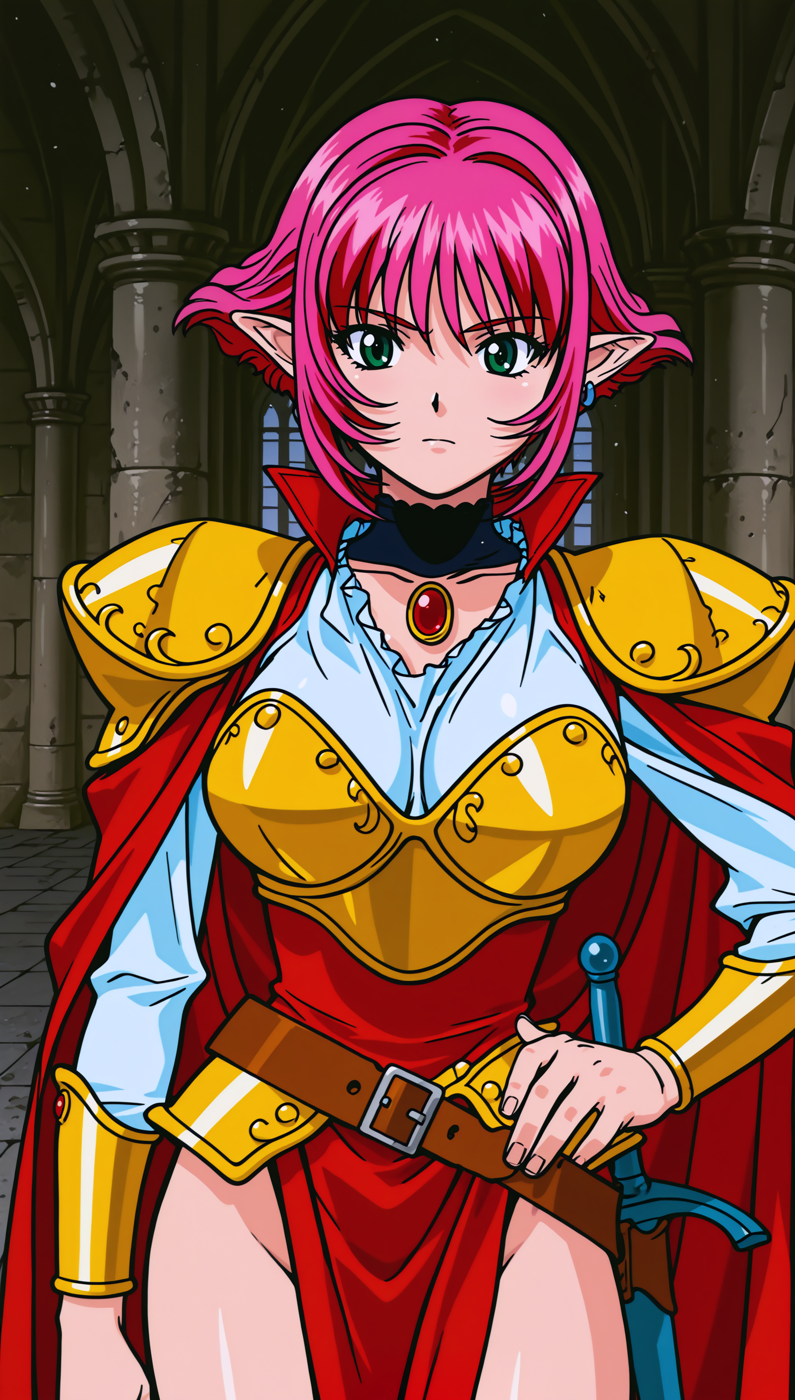 Cala: short sleeves, frills, crop top, no panties, shoulder armor, pauldrons, breastplate, vambraces, bracer