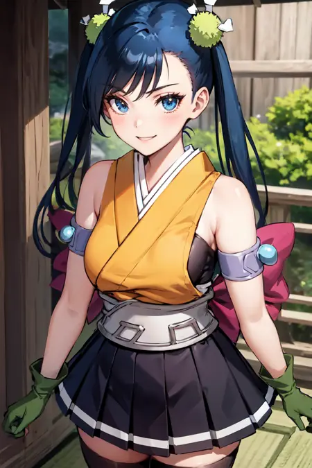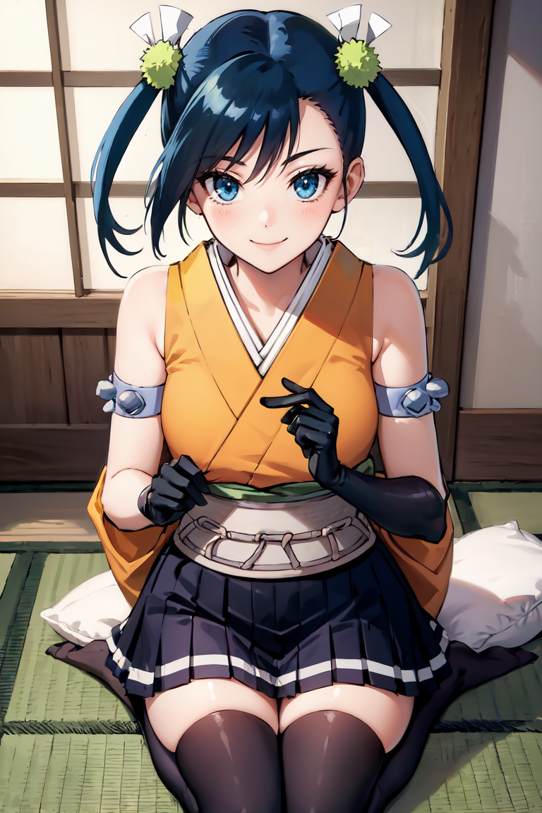 "日本の服、黄色のシャツ、腕章、スカート、紫のタイツ、手袋"