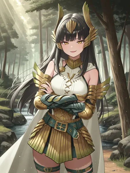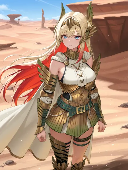 Tags (clothes): jin dahaad armor, knife sheath, headgear, gorget, white cape, white sleeveless sweater, armored armlet, armored vambraces, green belt, faulds, armored sandals