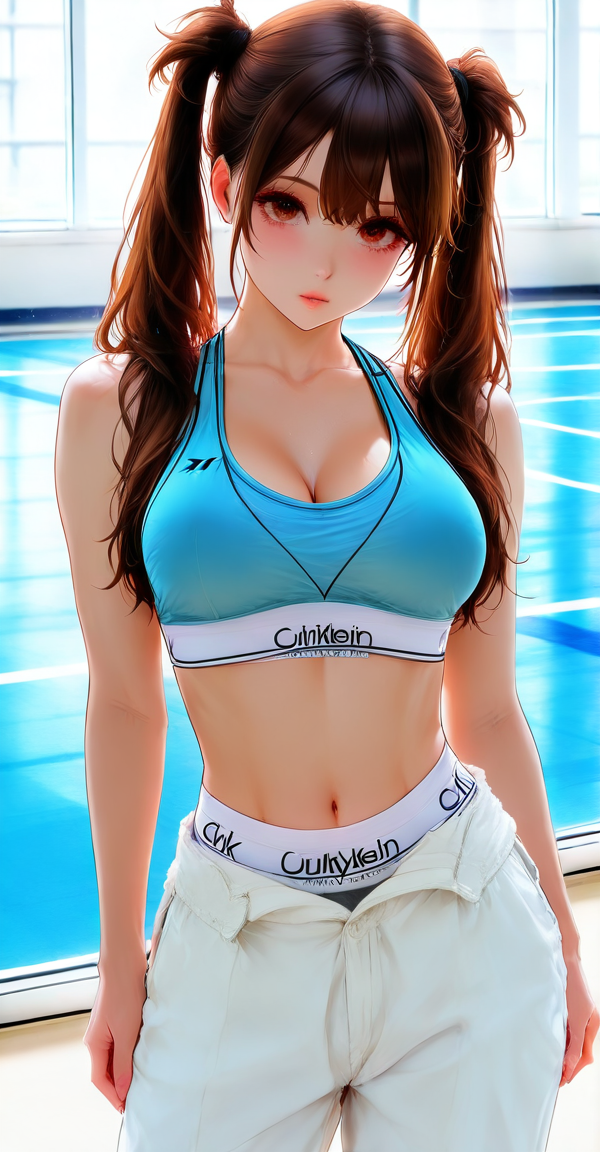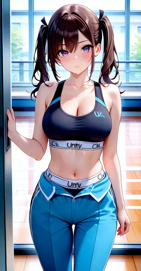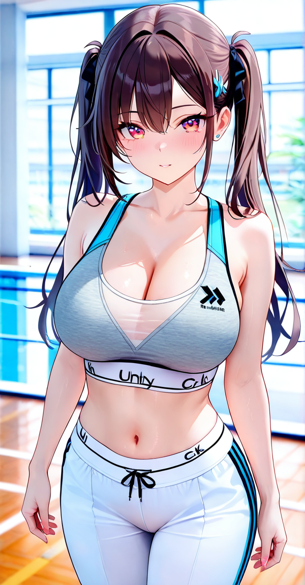 xg1, underwear, sports bra, cleavage, pants, wearing a sheer mesh outfit, navel