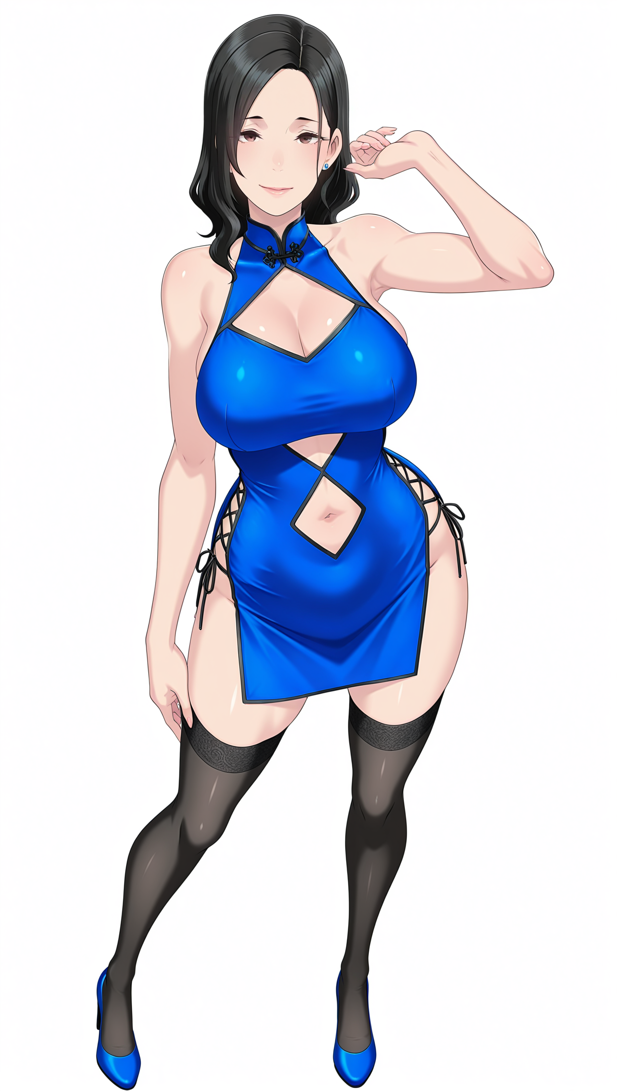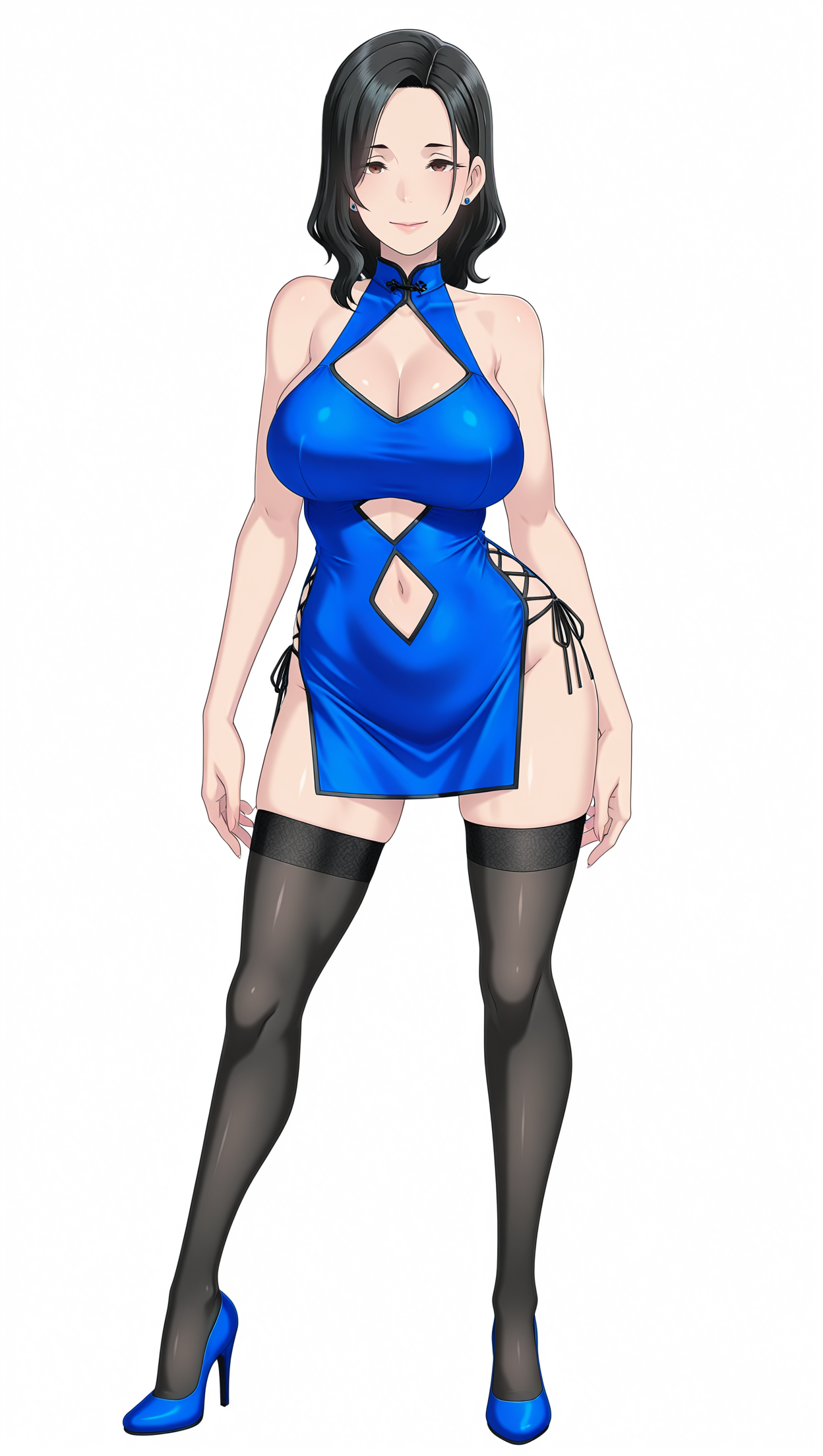 애니메이션 컬러링, 걸작, 최고 품질, 놀라운 품질, butcha-u 스타일, 1소녀, 성숙한 여자, 중간 길이 머리, (어두운 검은 머리:1.2), 나뉜 앞머리, 완벽한 눈, 갈색 눈, 큰 가슴, 귀걸이, lunarcutqipao, 할터넥, 드레스, 사이드 타이 드레스, 소매 없음, 파란 드레스, 허벅지 스타킹, 검은 허벅지 스타킹, 하이힐, 파란 신발, 옷 절개부, 배꼽, 복부, 혼자, 포즈, 서 있음, 시청자 바라봄, 정면, ((((흰 배경, 단순한 배경))))