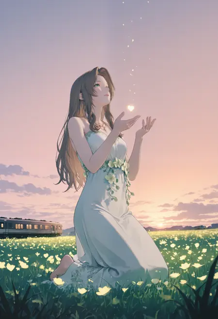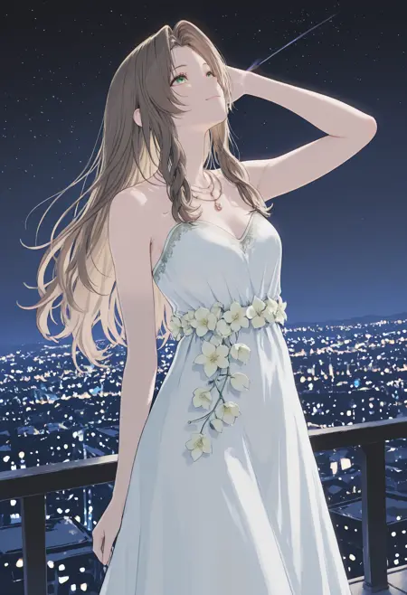 推荐提示词:ff7raerithwhitedress, aerith gainsborough, small breasts, necklace, flowers on dress,