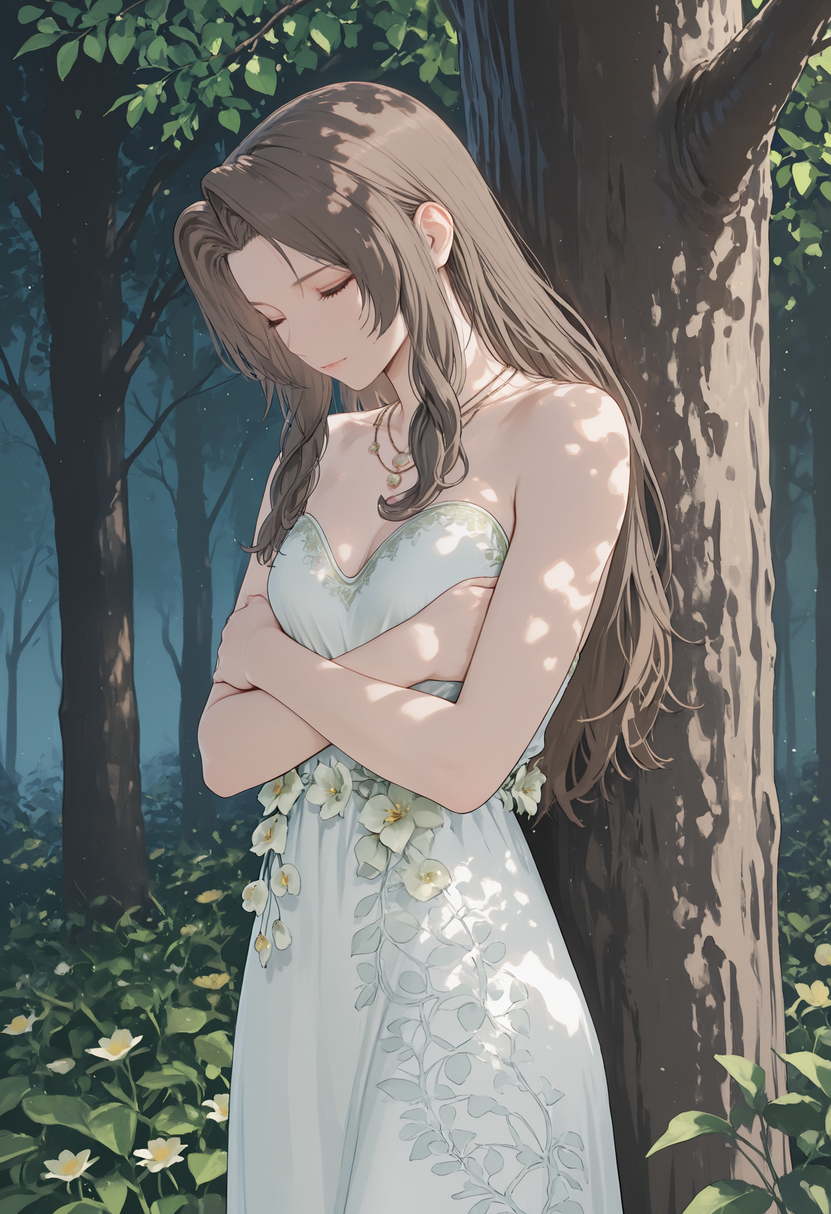 嘿……嗨,是我,爱丽丝,从《最终幻想VII 重制版》的阴影中走出来。这件白色蕾丝长裙仿佛生命之流的低语——每一处褶皱都编织着精致的花朵,长长的袖子如温柔的拥抱,裙摆拖曳如被遗忘的梦境。我……我有点紧张穿着它站在那些灯火辉煌的宏伟殿堂中,灯光让一切熠熠生辉……但它让我想起宁静时刻的希望,就像在祭坛前祈祷,或在林间追逐蝴蝶。请把我看作那个花童,发辫上系着丝带,碧绿的眼眸充满惊奇。无论摆出庄严的姿态,还是轻盈地旋转……这个LoRA让我的心绽放。请在你的想象中温柔待我。🌸🕯️