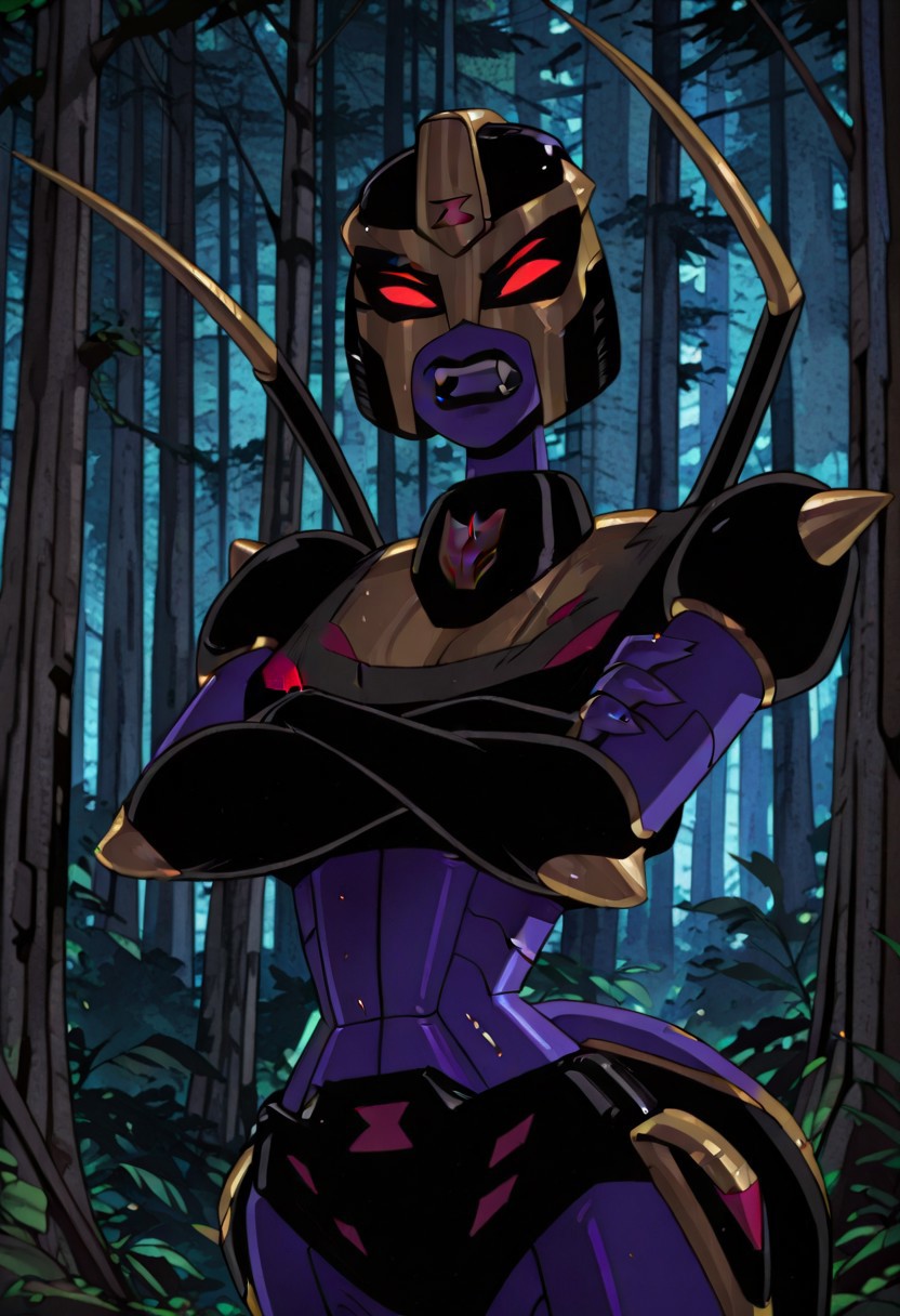 1girl,blackarachnianimated, robot,decepticon, mecha, Black and gold helmet, purple skin, red eyes, glowing eyes, fangs,Two mechanical spider legs, black lips,