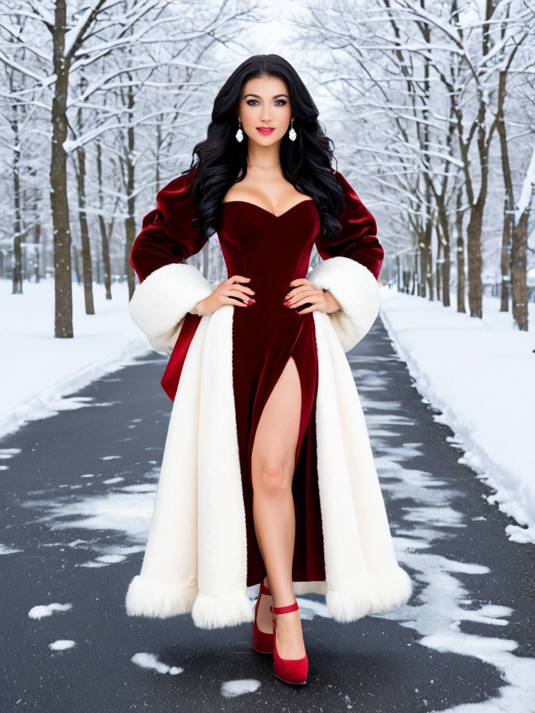 겨울 여신은 차가운 불이다—캐시미어 브라레트 위에 풀어입은 인조 모피 코트, 페인트 마감 처리된 허벅지까지 오는 부츠가 눈을 으스스 밟고, 벨벳은 배꼽까지 파고든다. 색상은 얼음과 불꽃이다: 눈백색, 자정, 버건디. 소재는 포근히 감싸며 드러낸다: 캐시미어, 페인트 마감, 열전도 레이스. 액세서리는 따뜻하면서도 날카롭다: 서리 립스틱, 크리스탈 체인, 핫 토디의 안개. 여인은 포근하면서도 만질 수 없으며, 벽난로의 빛에 실루엣이 드러나고, 숨결이 보이며, 피부는 붉게 달아올랐다. 이것이 겨울의 섹시함이다—서리 아래 뜨거운.