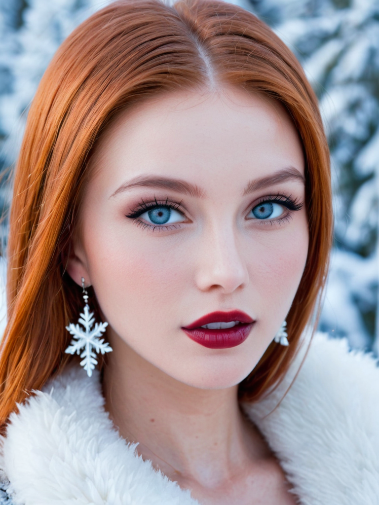 wintergoddess, close-up portrait, frost lipstick, flushed skin, breath visible in cold air