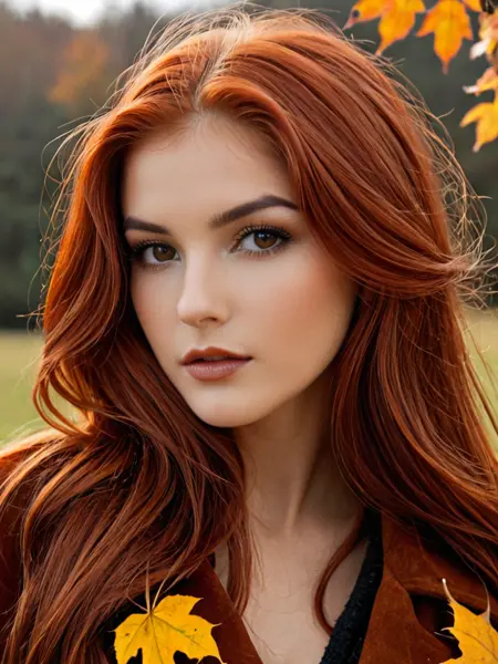 autumnvixen, close-up portrait, leaves in hair, warm breath in cold air, brooding allure