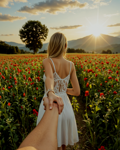 WD14 TaggerとFlorence、そしてシンプルなプロンプト「Woman holding a man's hand walking through a field of flowers」のみを使って作成した最終画像: