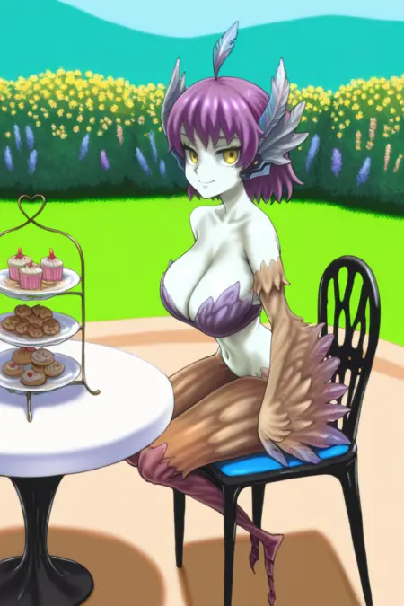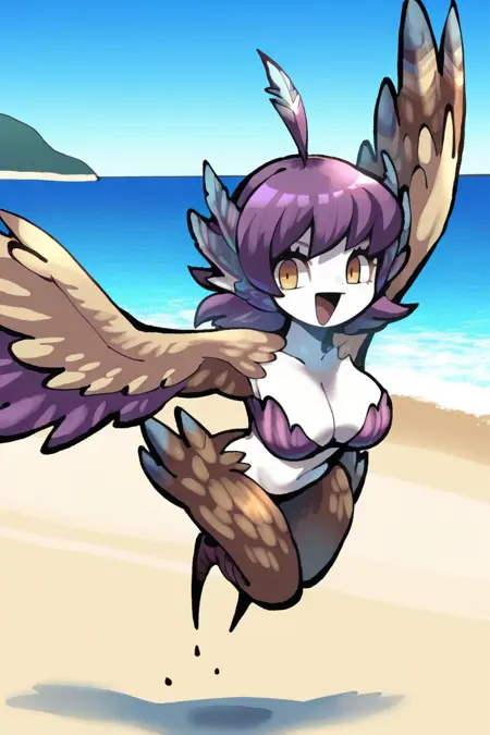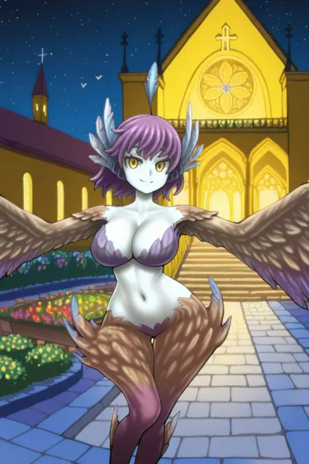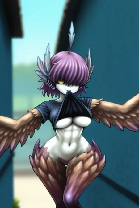 Helpful Tags: 1girl, monster girl, harpy, medium hair, purple hair, feather hair, ahoge, yellow eyes, pale skin, winged arms, feathered wings, cleavage, large breasts, navel, bird legs,