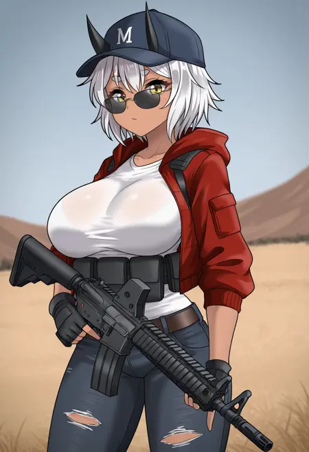 - CB-0N1, 暗色肌の女性, 短髪, 白髪, アホ毛, 角, 短い眉, 黄色い目, 大きな胸