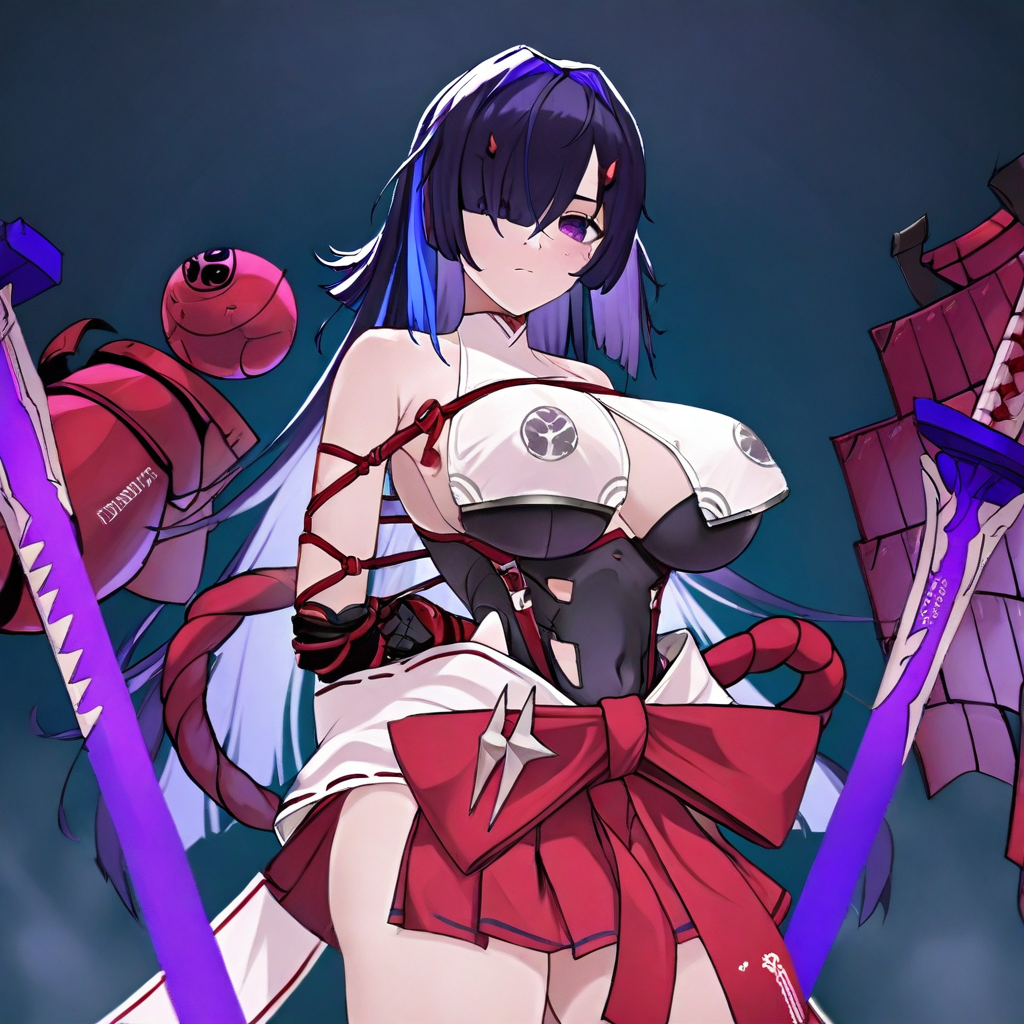 紫色眼睛,长发,紫色头发,蓝色头发,多色头发,双色头发,彩色内发,发丝渐变,发丝内收,头发遮住一只眼睛,齐刘海,分刘海,侧分,鬓发,齐耳鬓发,大乳房