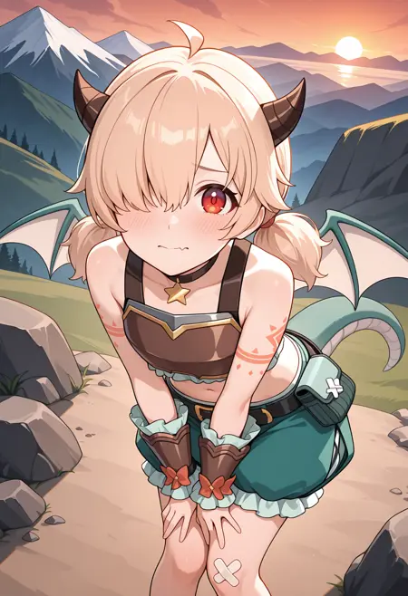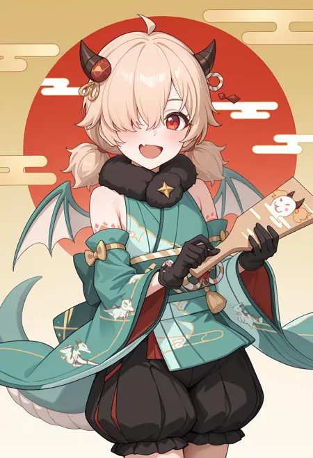 pcrinori, 드래곤 소녀, 연한 갈색 머리, 금발, 빨간 눈, 한쪽 눈을 가리는 머리카락, 한쪽 눈 가림, 아호게, 짧은 트윈테일, 낮은 트윈테일, 드래곤 뿔, 드래곤 꼬리, 드래곤 날개, 피부 이빨,