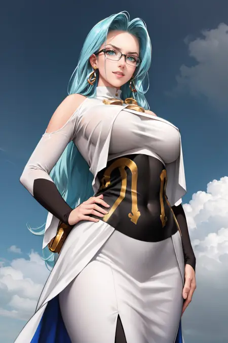 添加 "眼镜、耳环、白色连衣裙、胸下部、新娘手套" 以呈现她的典型造型。