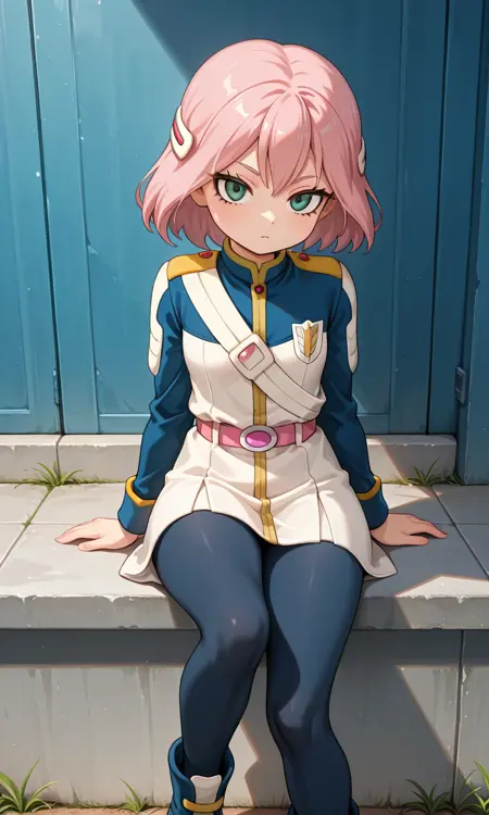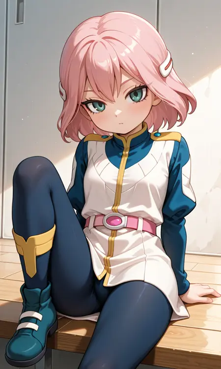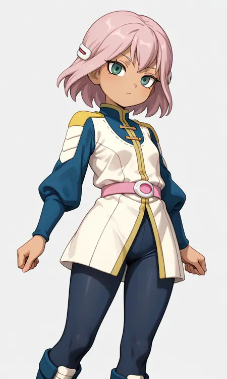 미도(Inazuma Eleven), 분홍색 머리, 녹색 눈, 단발, 머리 장신구, 머리핀, 작은 가슴, 허벅지, 작은 체격