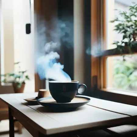 In p400 style, ある男性が日差しの差し込むバルコニーに座り、後ろに植物を背景にコーヒーを飲んでいる、柔らかな背景のぼかし、繊細なパステルカラーパレット、リラックスしたムード。