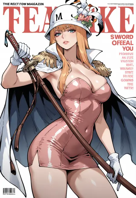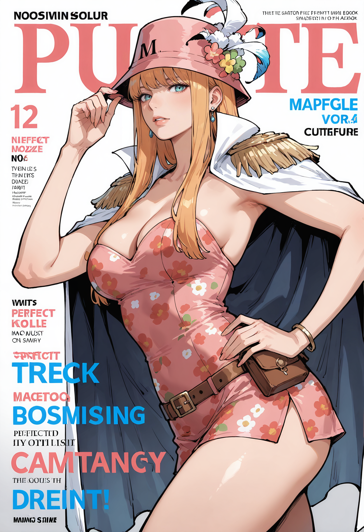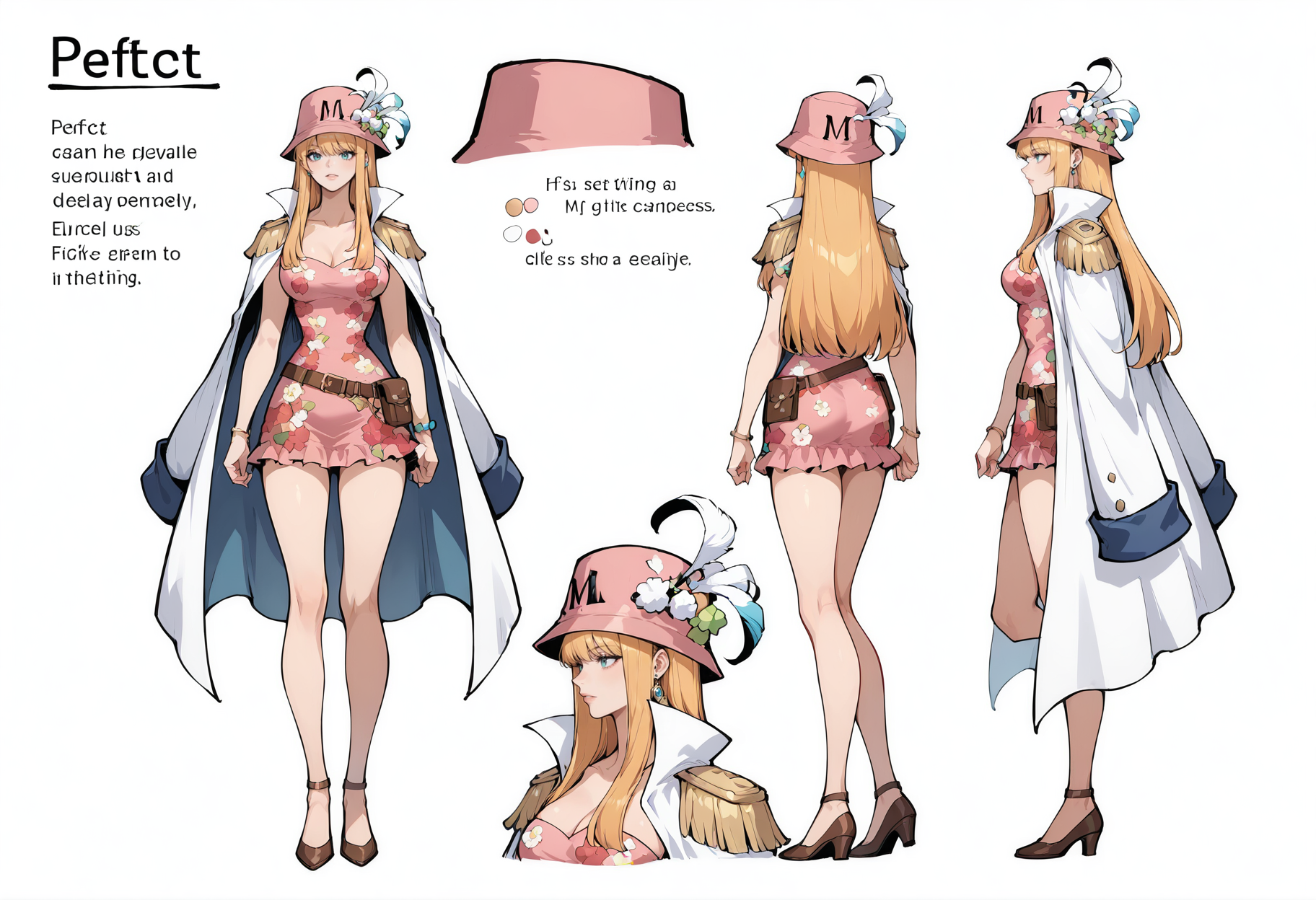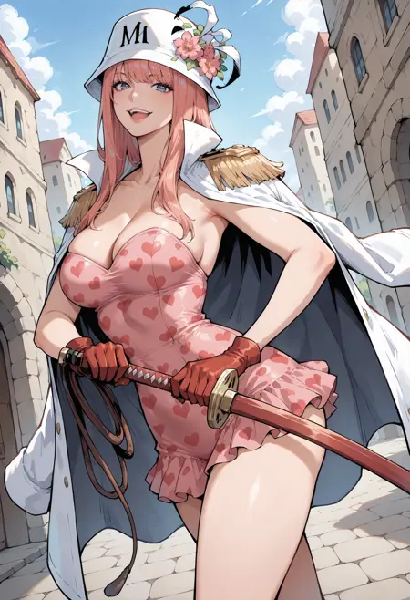 帽子、ピンク色の頭飾り、帽子の羽、羽、胸、ハイヒール、ドレス、ピンク色のドレス、ベルト、肩にかけたコート、ジュエリー、マント、ブレスレット、短いドレス、中程度の胸、白いマント、大きな胸、イヤリング、足を露出、花柄、肩章、肩にかけたジャケット、ストラップレス、ポーチ、ストラップレスドレス、茶色のベルト