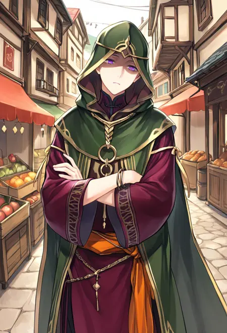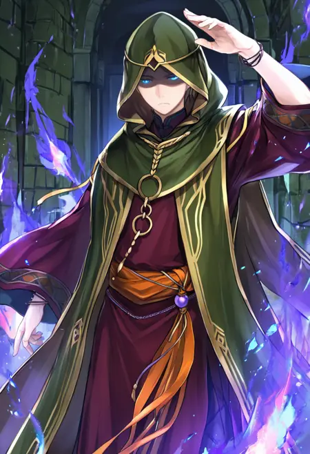トリガー単語:BramimondFE、1other、緑のフード、フードをかぶる、影のついた顔、輪冠、緑のマント、赤いローブ、広い袖、赤い袖、ブレスレット、ジュエリー、オレンジ色の帯、サンダル、暗いオーラ、