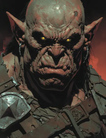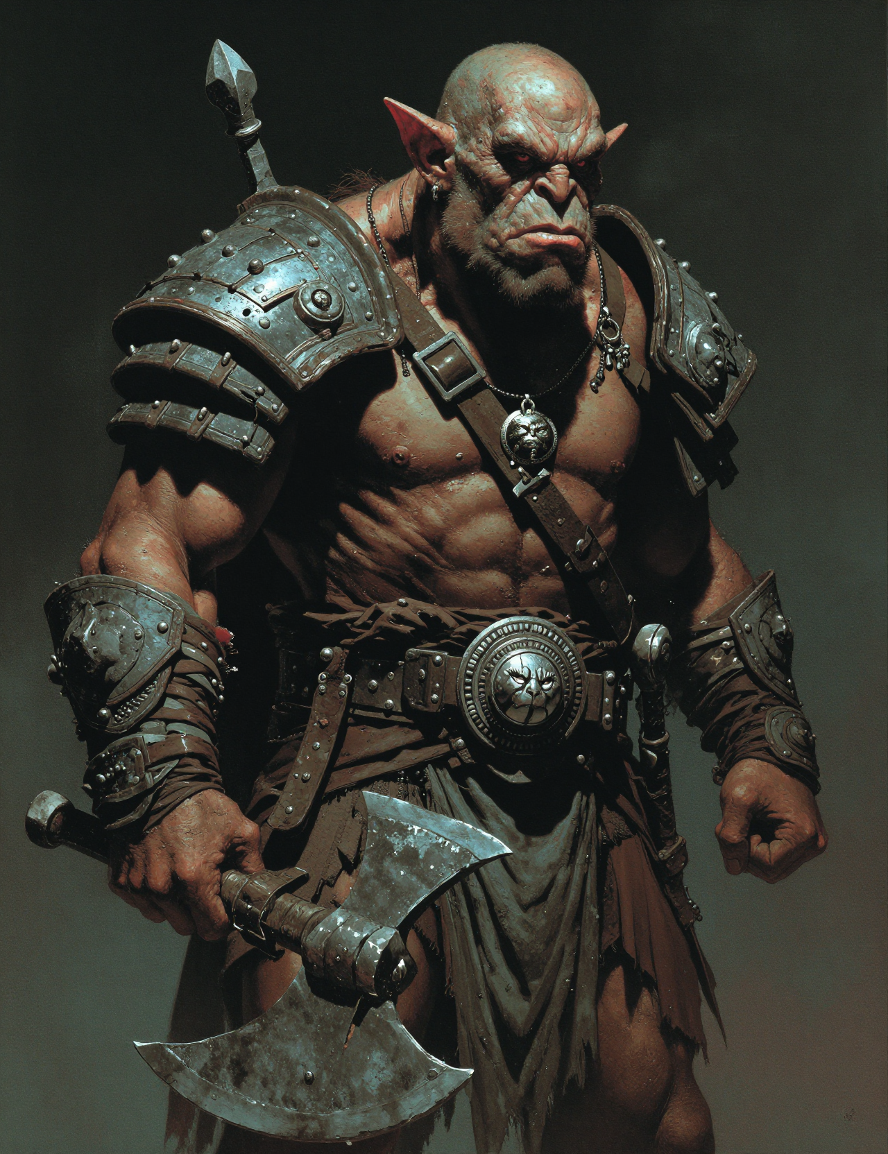 어두운 분위기의 배경을 배경으로 삼아, 거친 피부와 흉터 난 갑옷을 입은 오르크 전사가 무거운 전투도끼를 들고 있는 영화적인 중거리 장면, 강렬한 측면 조명, 고대비, 펄프 아트 스타일