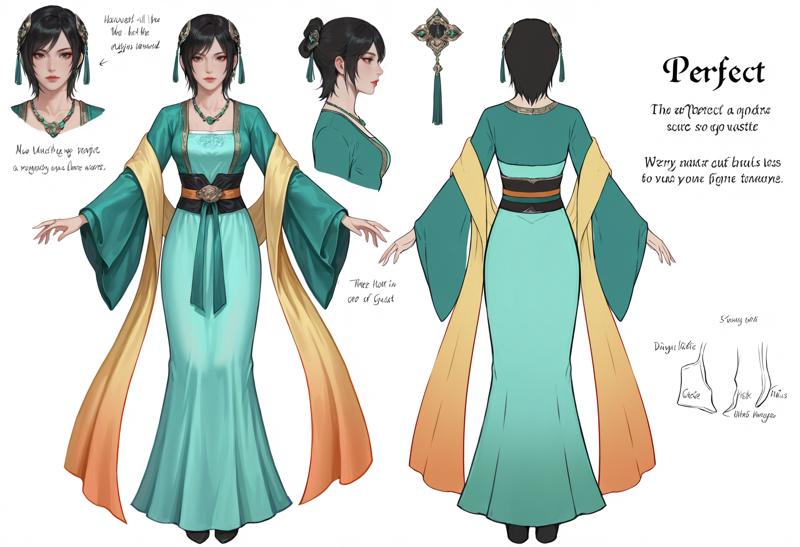 1girl,black eyes,brown eyes,black hair,short hair,lips,hair ornament,jewelry,necklace,hanfu,dress,chinese clothes,breasts,sash,wide sleeves,shawl,medium breasts,long sleeves,green dress,black footwear,aqua dress