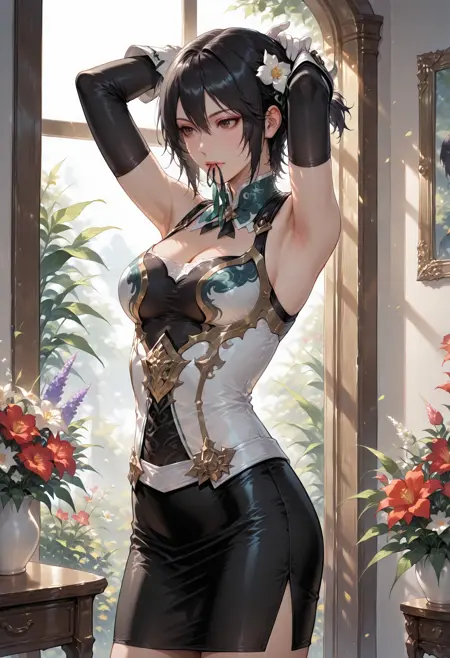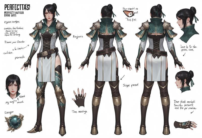 1girl,lips,brown eyes,black hair,short hair,hair bun,single hair bun,makeup,gloves,fingerless gloves,thighhighs,belt,boots,thigh boots,armor,breasts,medium breasts,shoulder pads,side slit,elbow gloves,shoulder armor,corset,dress,ribbon