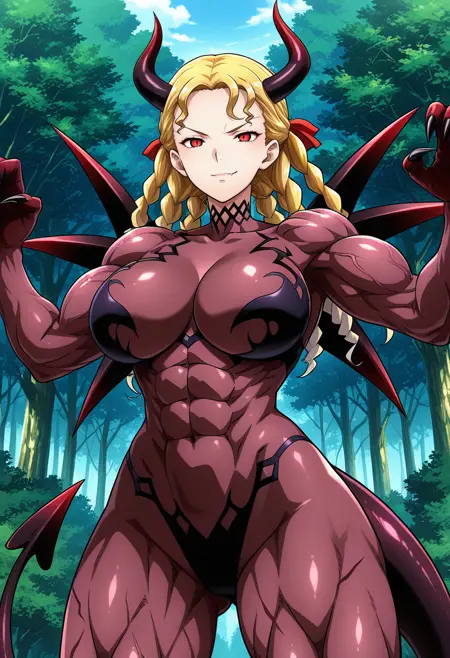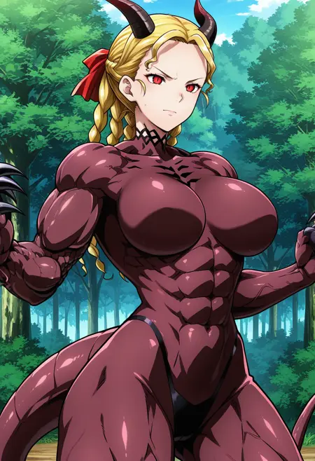 JelaGoul, 1boy, solo, 금발 머리, 파란 눈, 꼬리, 땋은 머리, 발톱, 근육질, 남성 중심, 복근, 머리 리본,