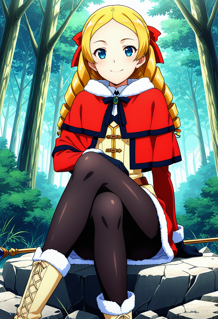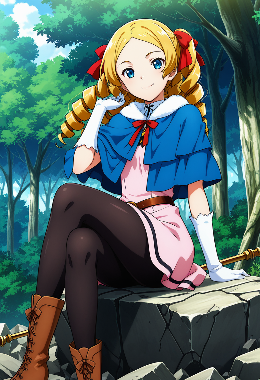JelaMage, 1girl, solo, 더블테일, 드릴 머리, 머리 리본, 파란 눈, 금발 머리, 장갑, 긴 머리, 지팡이, 드레스, 카프레트, 리본, 미소, 검은 팬티스타킹, 부츠,