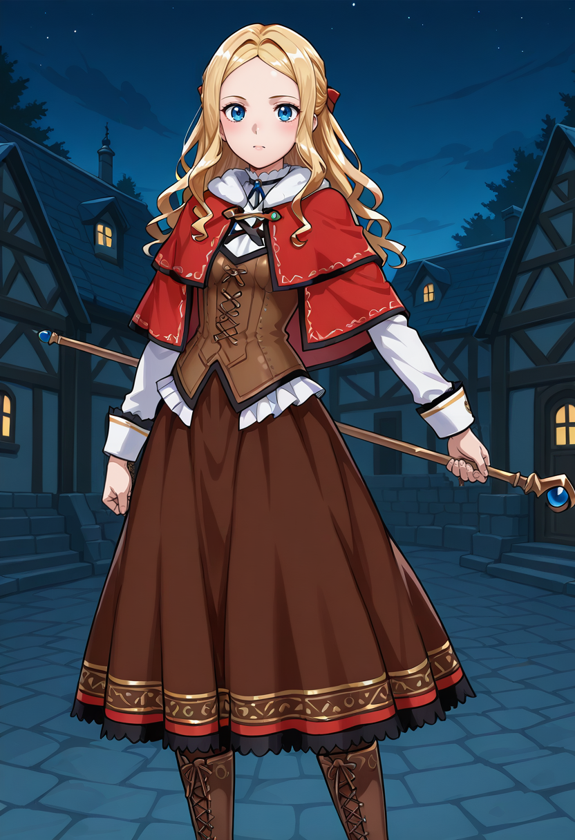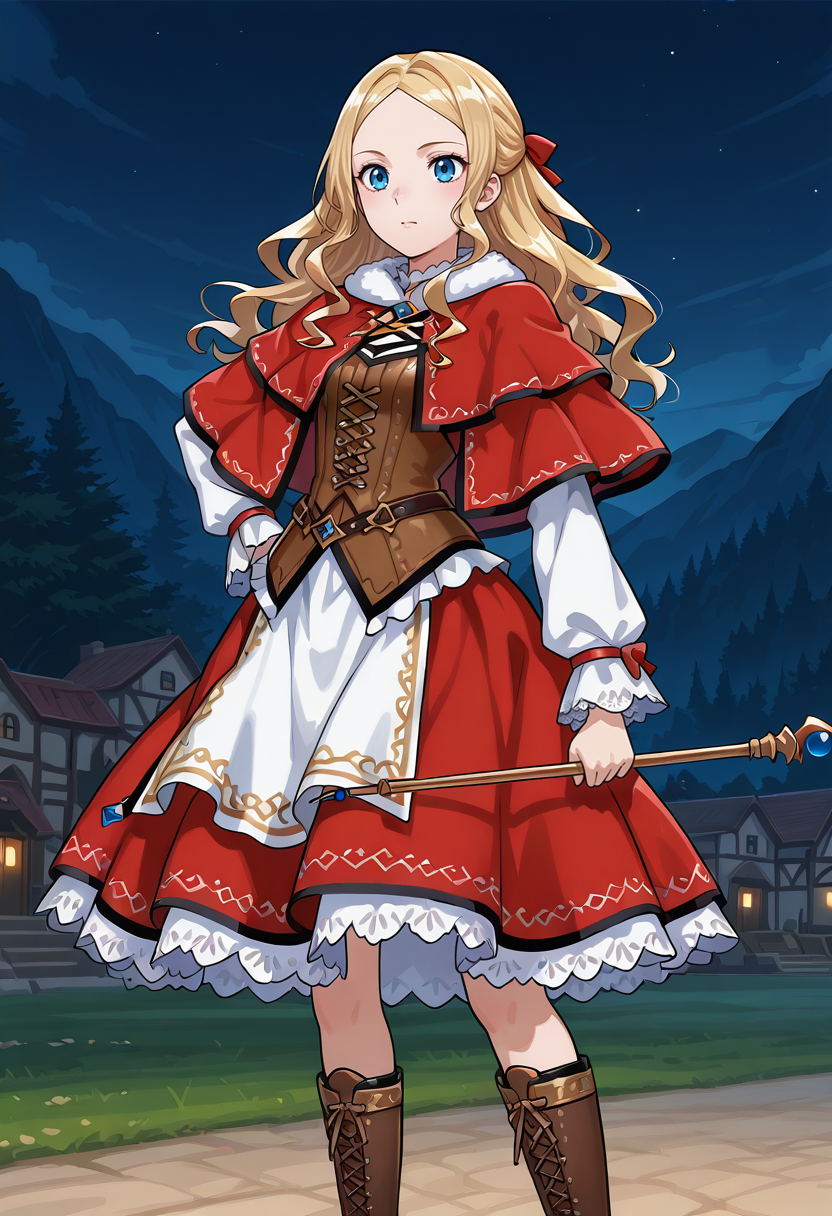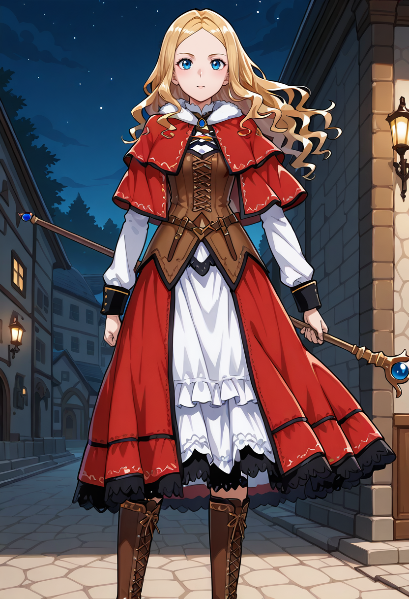 HighJelanda, 1girl, solo, 금발 머리, 긴 머리, 부츠, 지팡이 들고 있음, 드레스, 파란 눈, 십자 끈 신발, 카프레트, 무릎 길이 부츠, 긴 소매, 끈 신발, 갈색 신발, 프릴, 긴 치마,