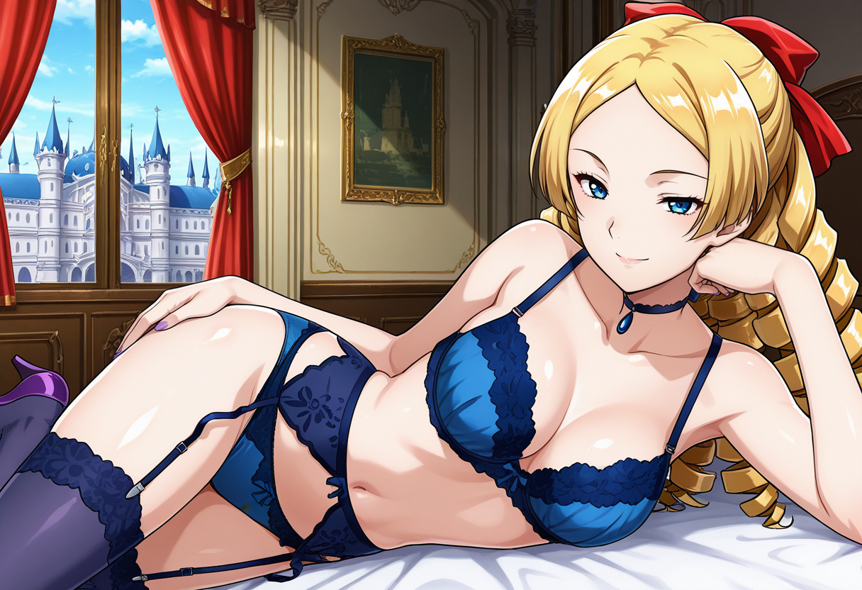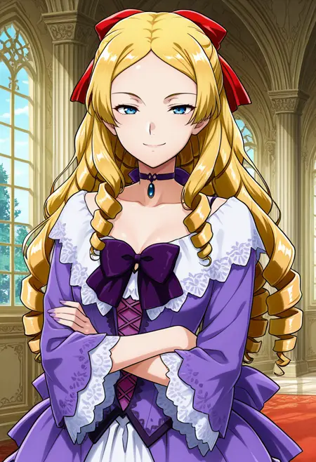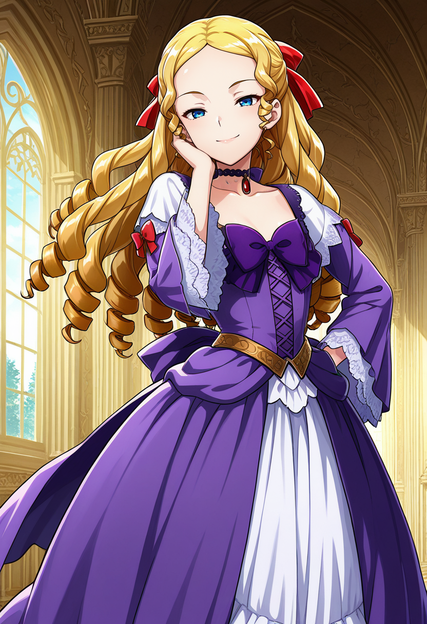 JelaPrincess, 1girl, solo, 금발 머리, 긴 머리, 초커, 드릴 머리, 리본, 미소, 보라색 긴 드레스, 파란 눈, 머리 리본, 리본, 하이힐, 보라색 신발,