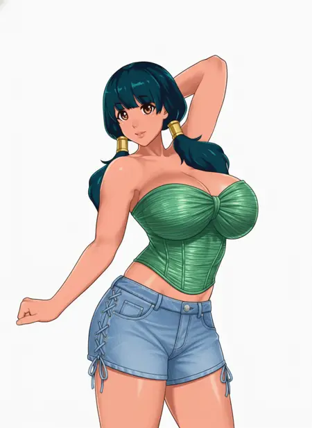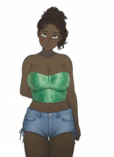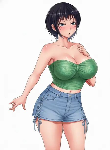 green top, short top, crop top, strapless top, band top, jewelry, cleavage, earrings, denim, bare shoulders, short shorts