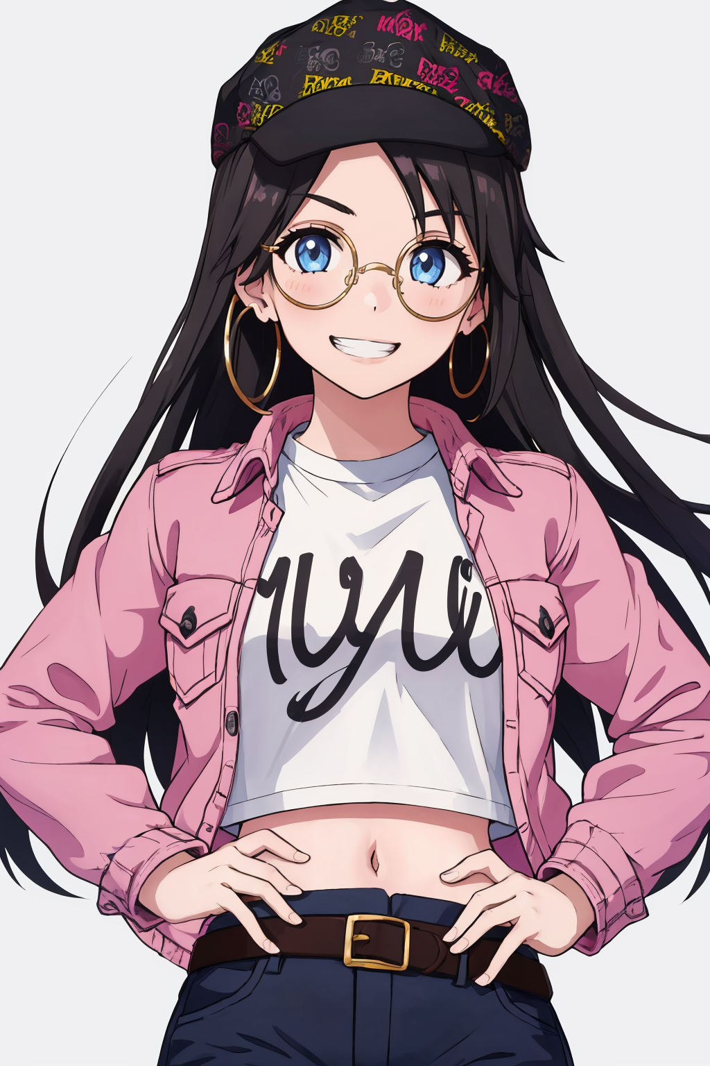 yuikapinkjacket,黑色头饰,眼镜,圆形眼镜,圆环耳环,粉红色夹克,白色衬衫,露脐,肚脐,腰带,短裤