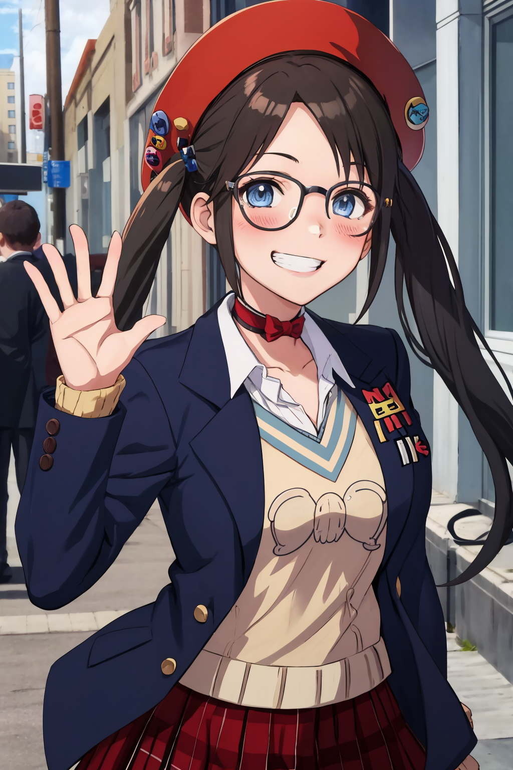 yuikaschool,贝雷帽,眼镜,双马尾,项圈,蝴蝶结,西装外套,徽章,校服,格子裙