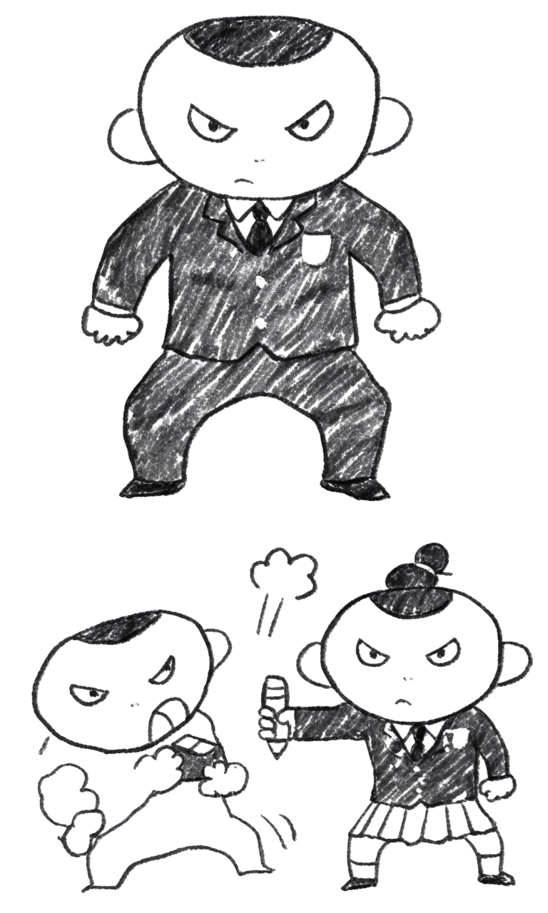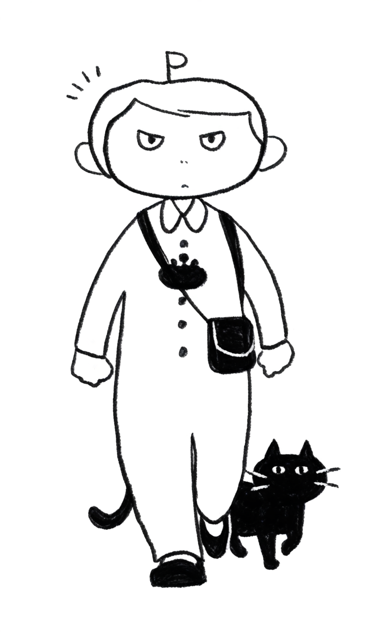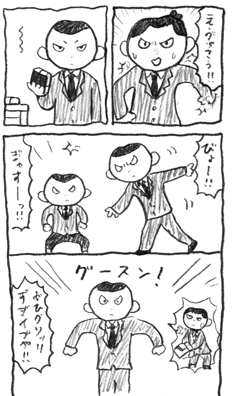 3コマ漫画スタイル、モノクロ、マンガスタイル、シンプルな線画、シュールなシーン