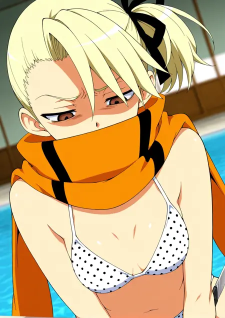 kirishima kirihiko, brown eyes, blonde hair, medium hair, side ponytail, hair ribbon, black ribbon, orange scarf, striped scarf, denim shorts, knee boots, brown footwear, black socks,