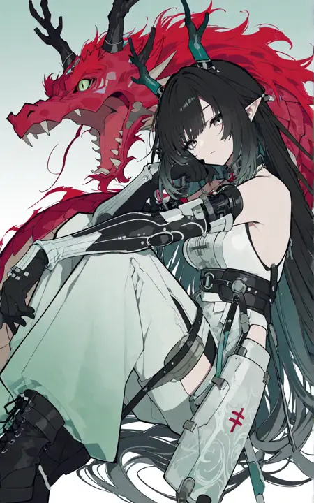 長い黒髪(ターコイズグラデーション)、緑の目、エルフの耳、白から緑へのグラデーションのテクスチャースタイルのノースリーブトップ、ハイウエストベルト、ワイドレッグパンツ、黒いメカニカルアームアーマー、黒い手袋、黒いショートブーツ、金属製のバックル、赤い装飾的なディテール、ドラゴンガール
