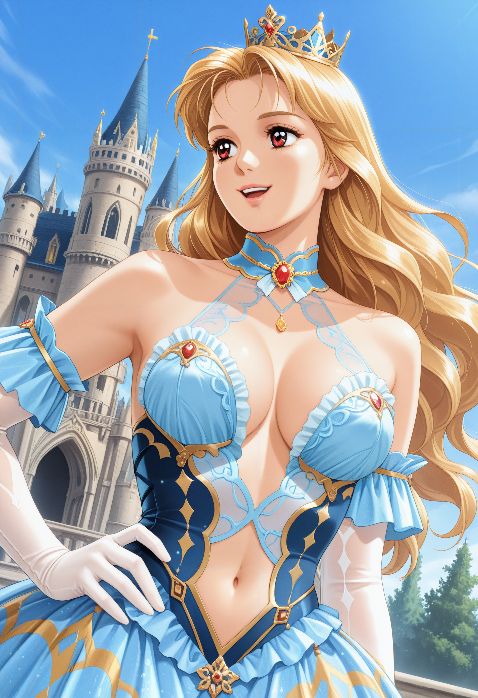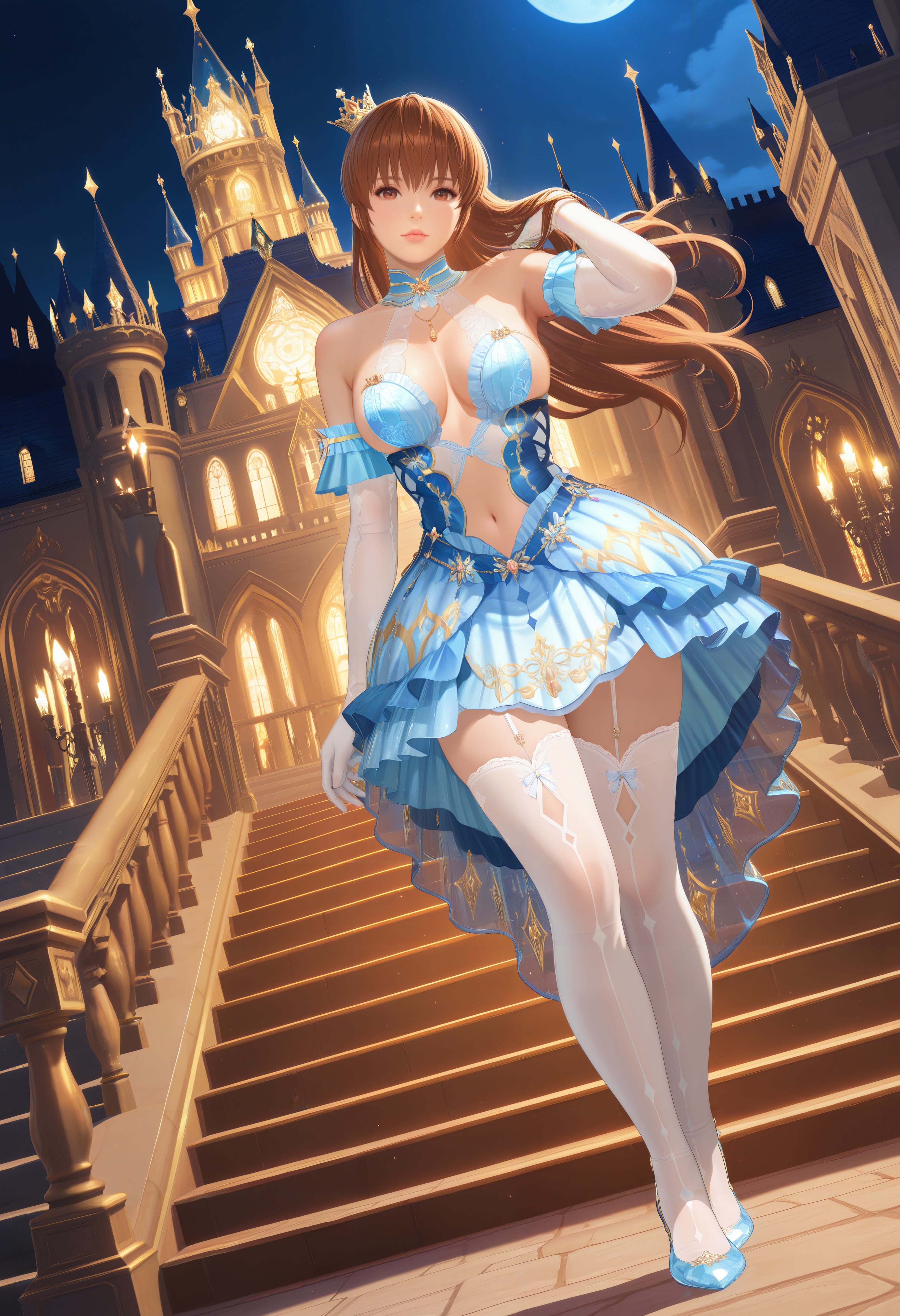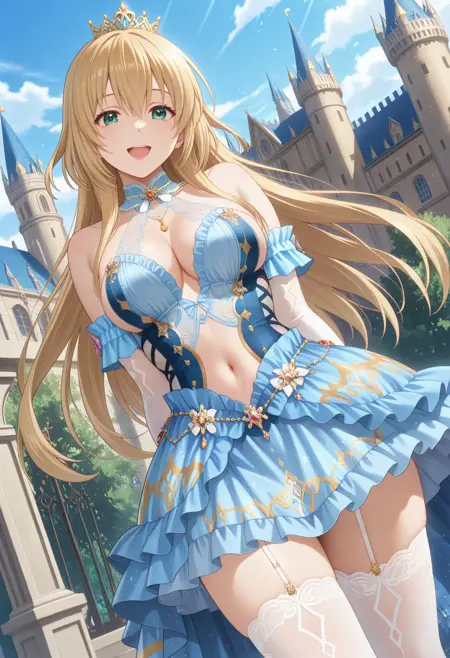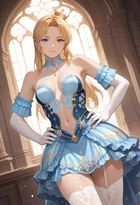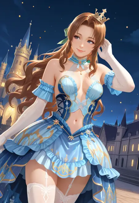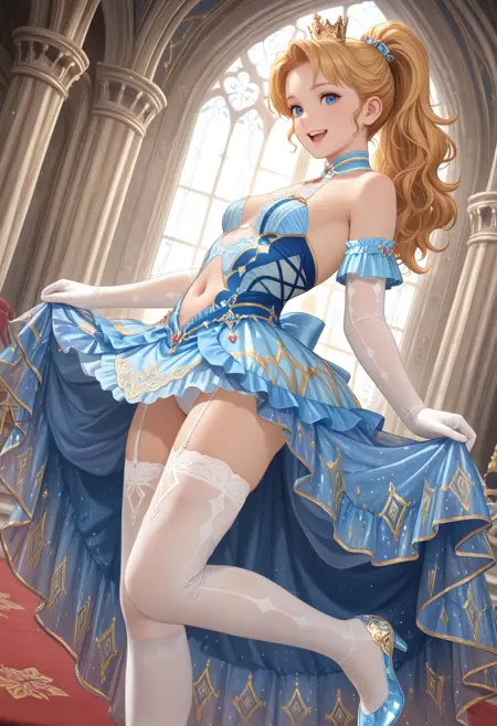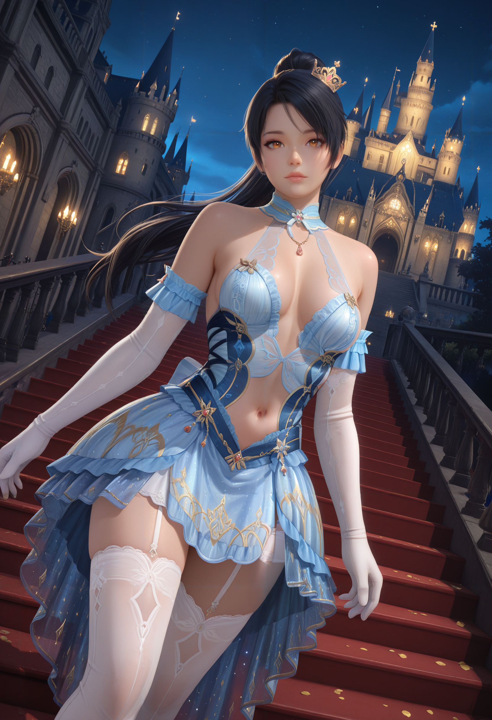 基本プロンプト:"CendrillonEscalier,crown,frilled dress,detached sleeves,elbow gloves,navel cutout,white thighhighs,blue glass high heels"