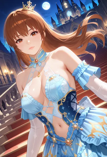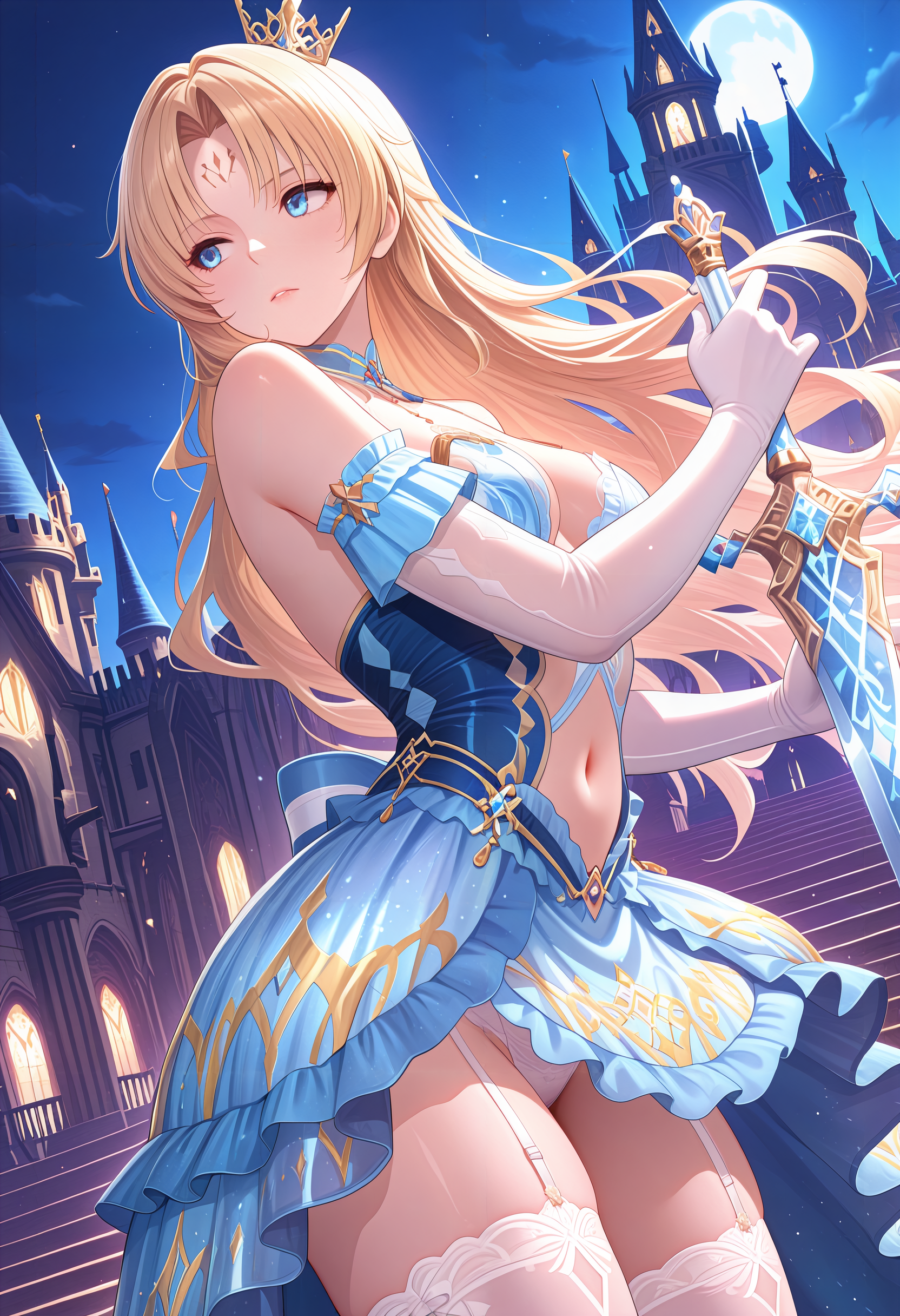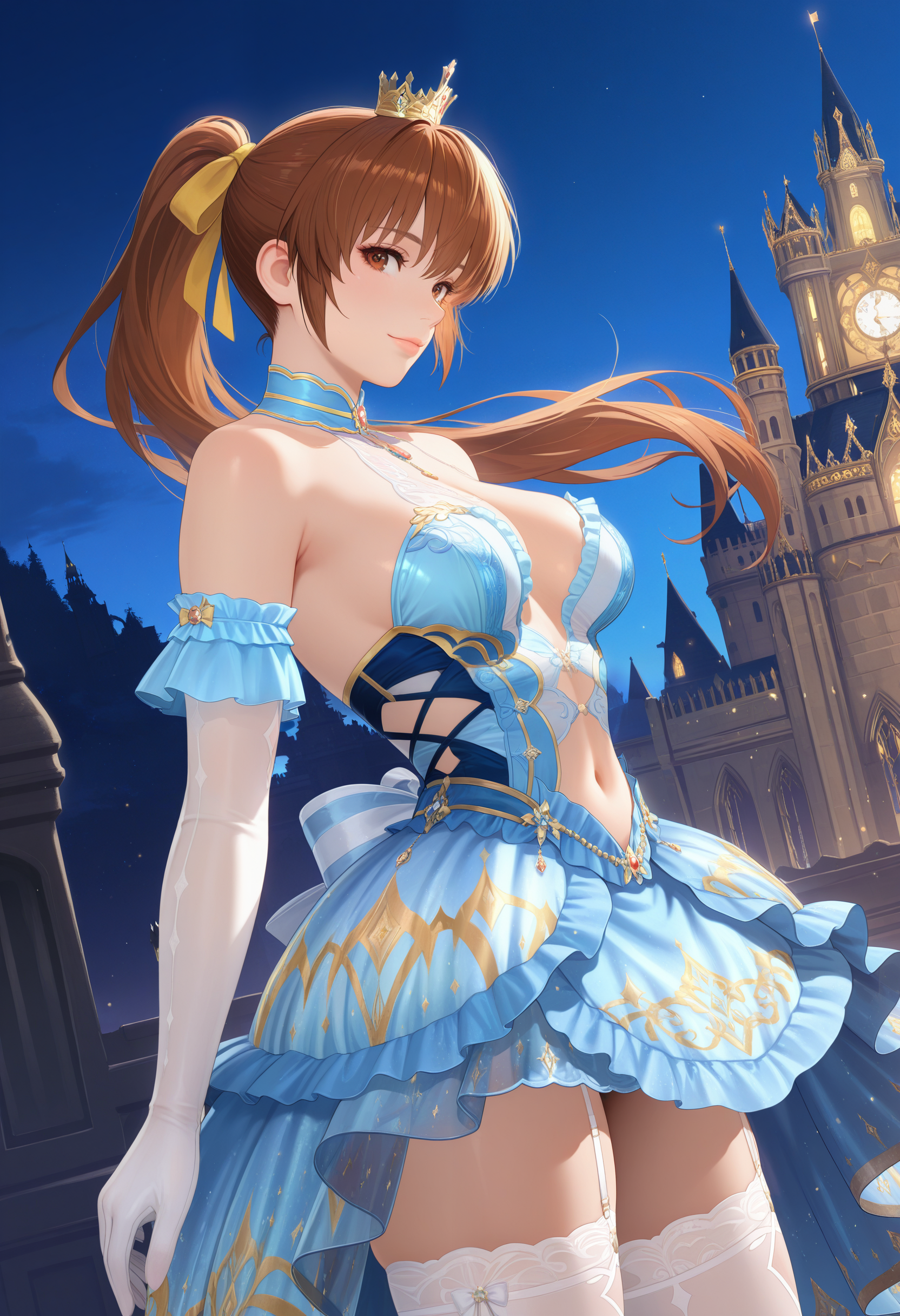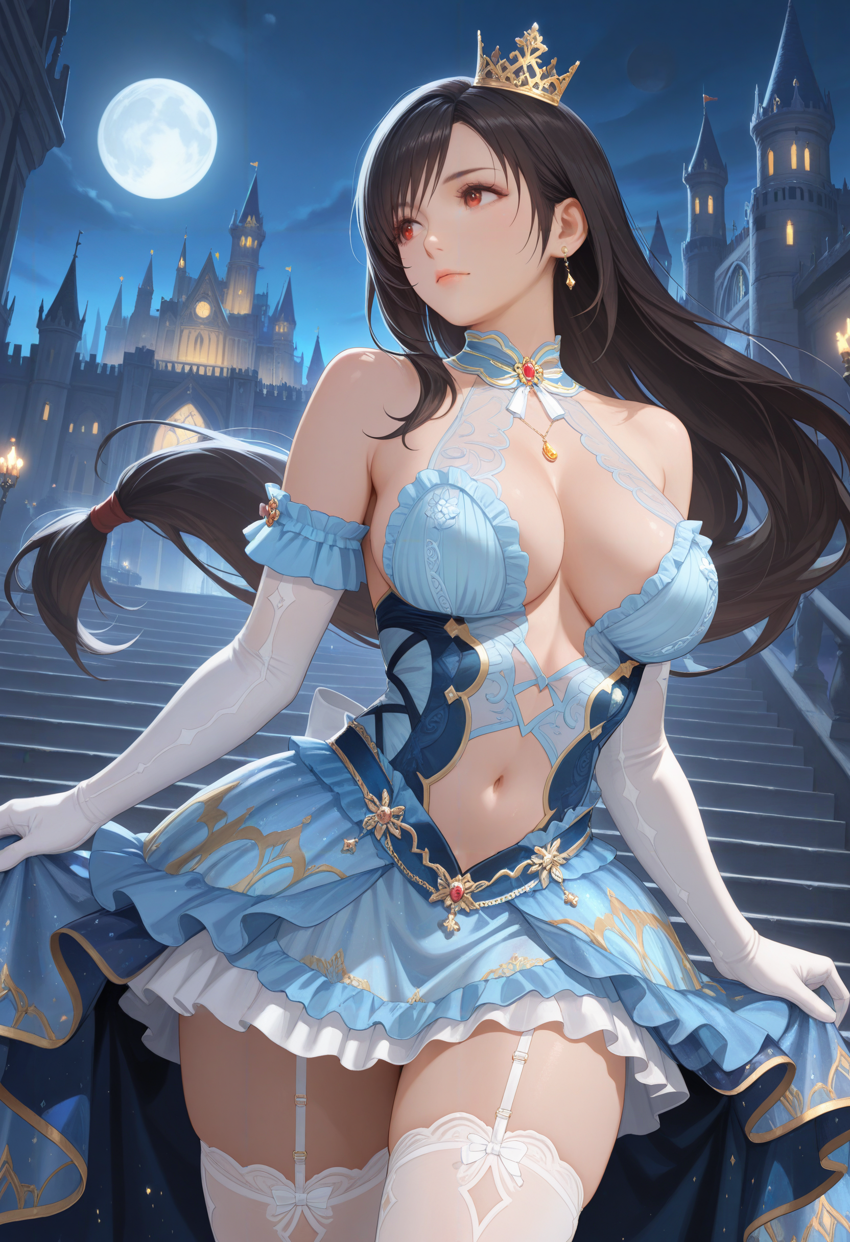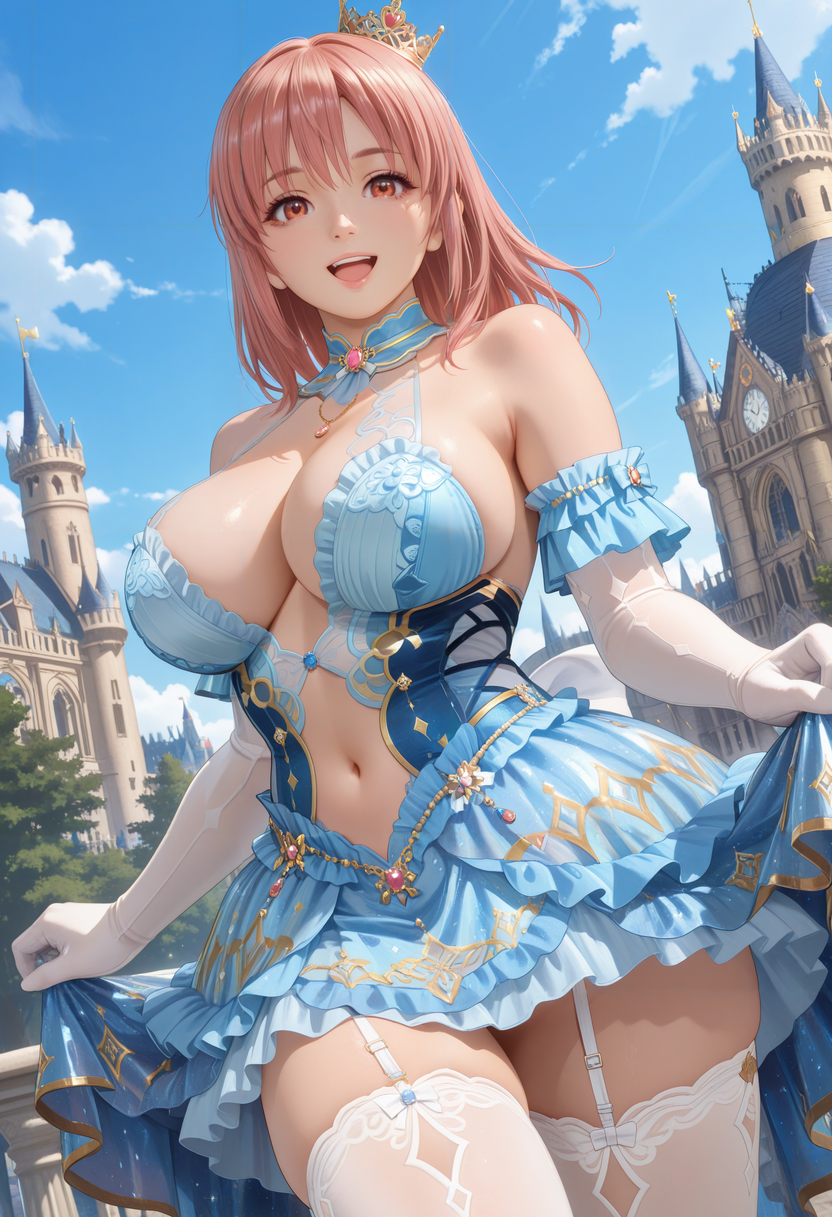基本プロンプト:"CendrillonEscalier,crown,frilled dress,detached sleeves,elbow gloves,navel cutout,white thighhighs,blue glass high heels"