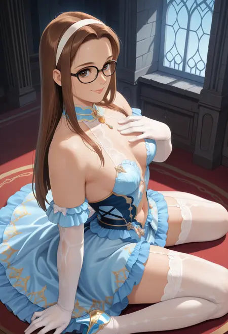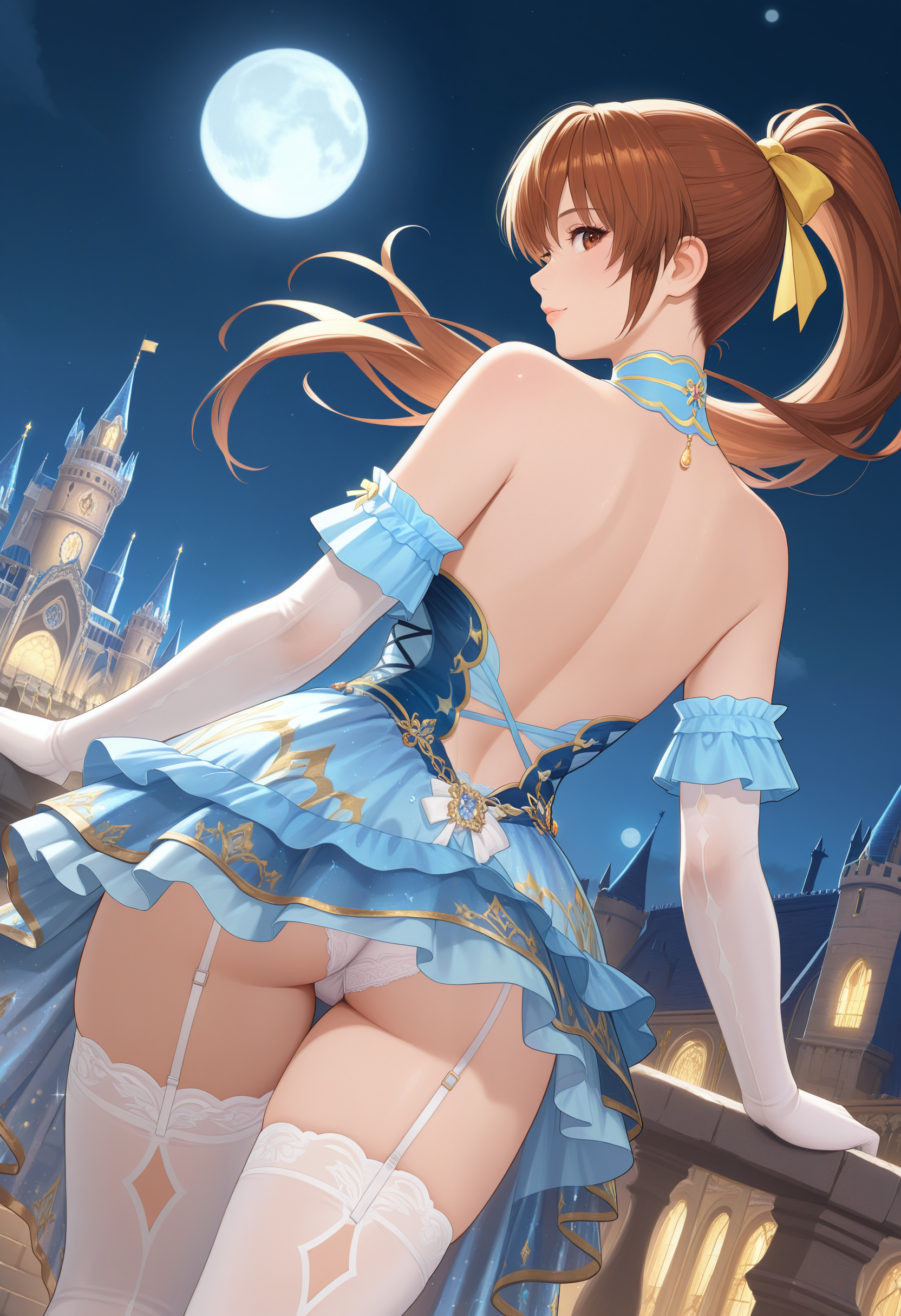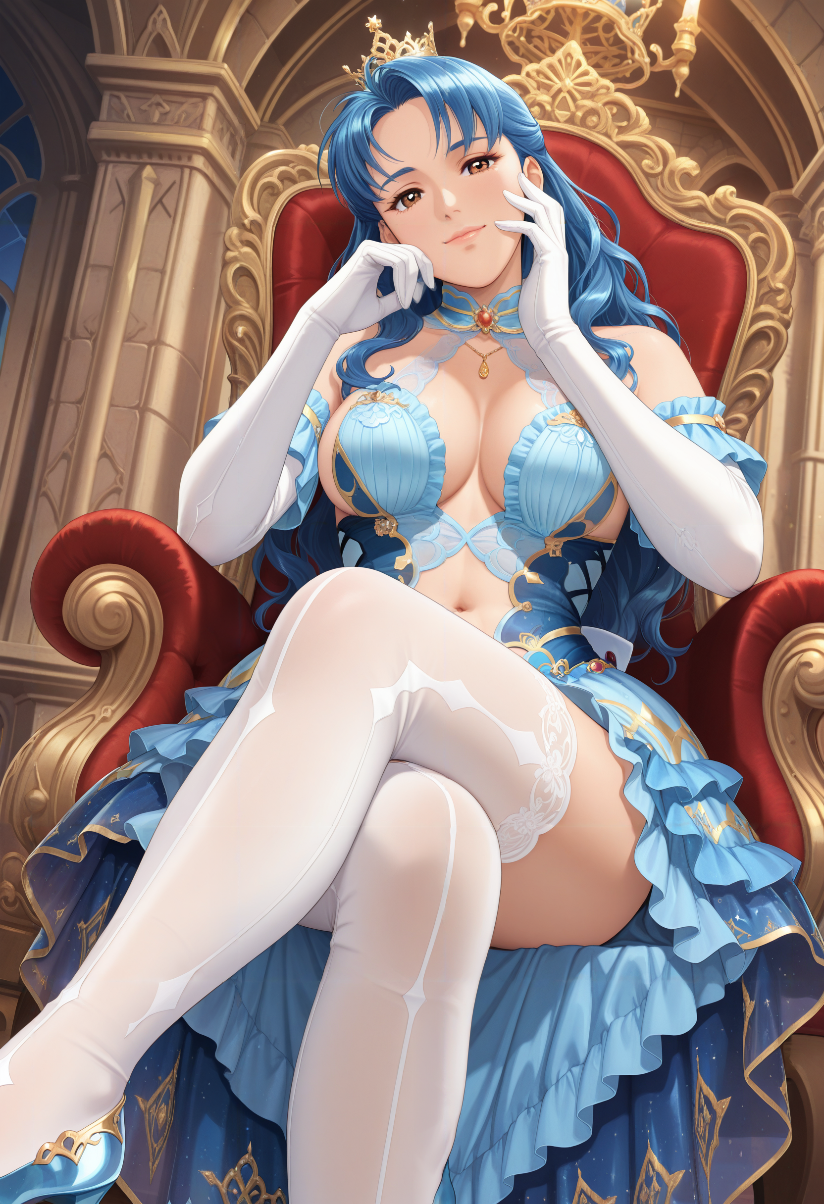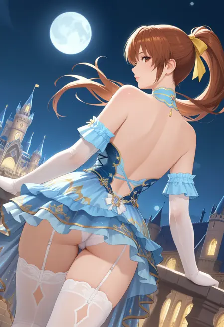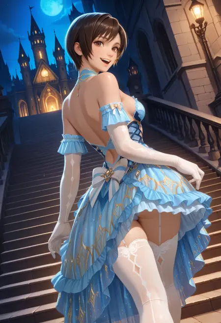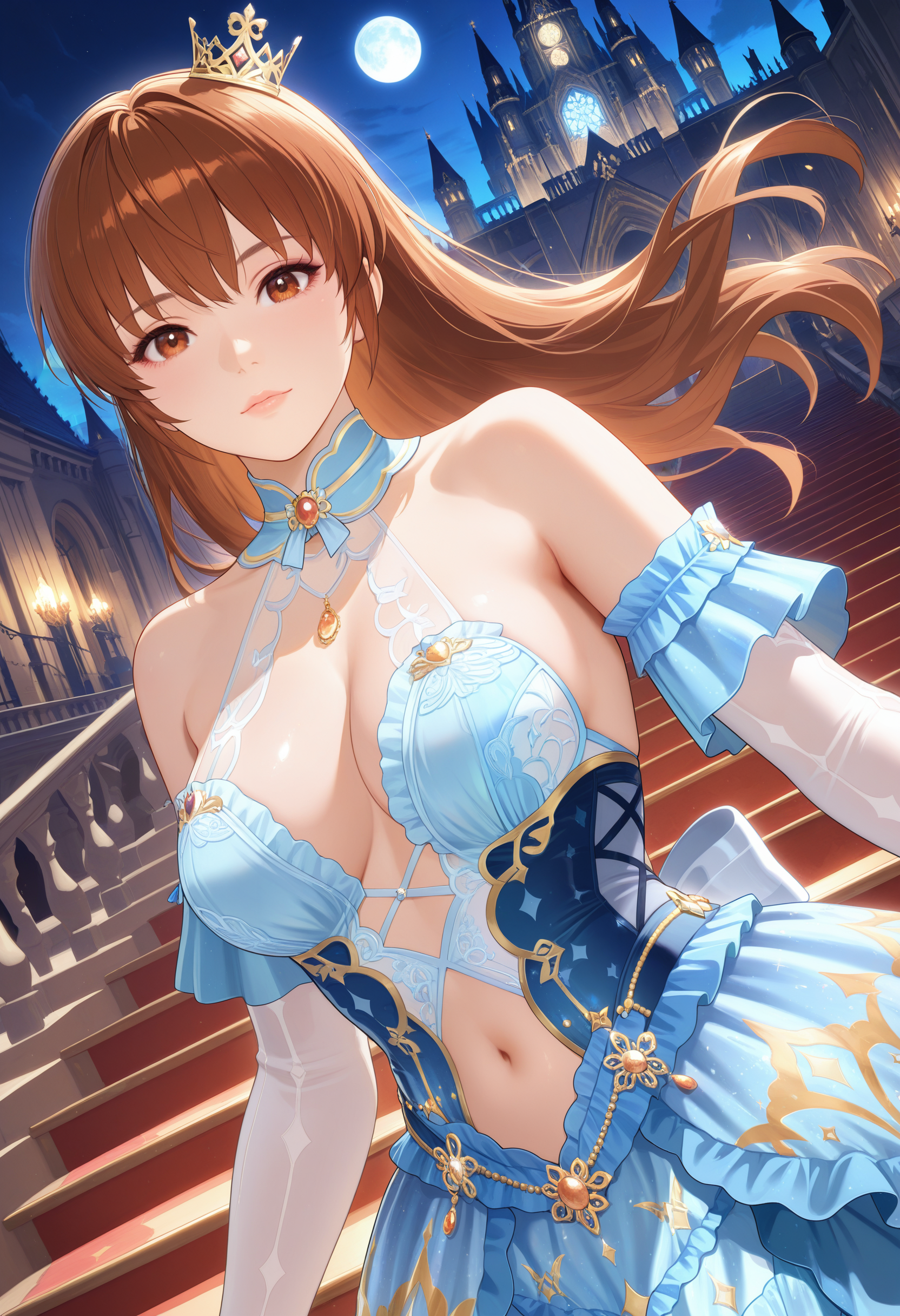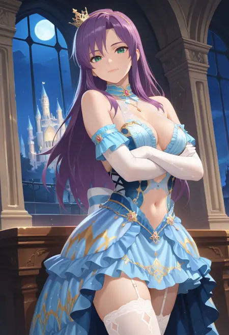基本プロンプト:"CendrillonEscalier,crown,frilled dress,detached sleeves,elbow gloves,navel cutout,white thighhighs,blue glass high heels"