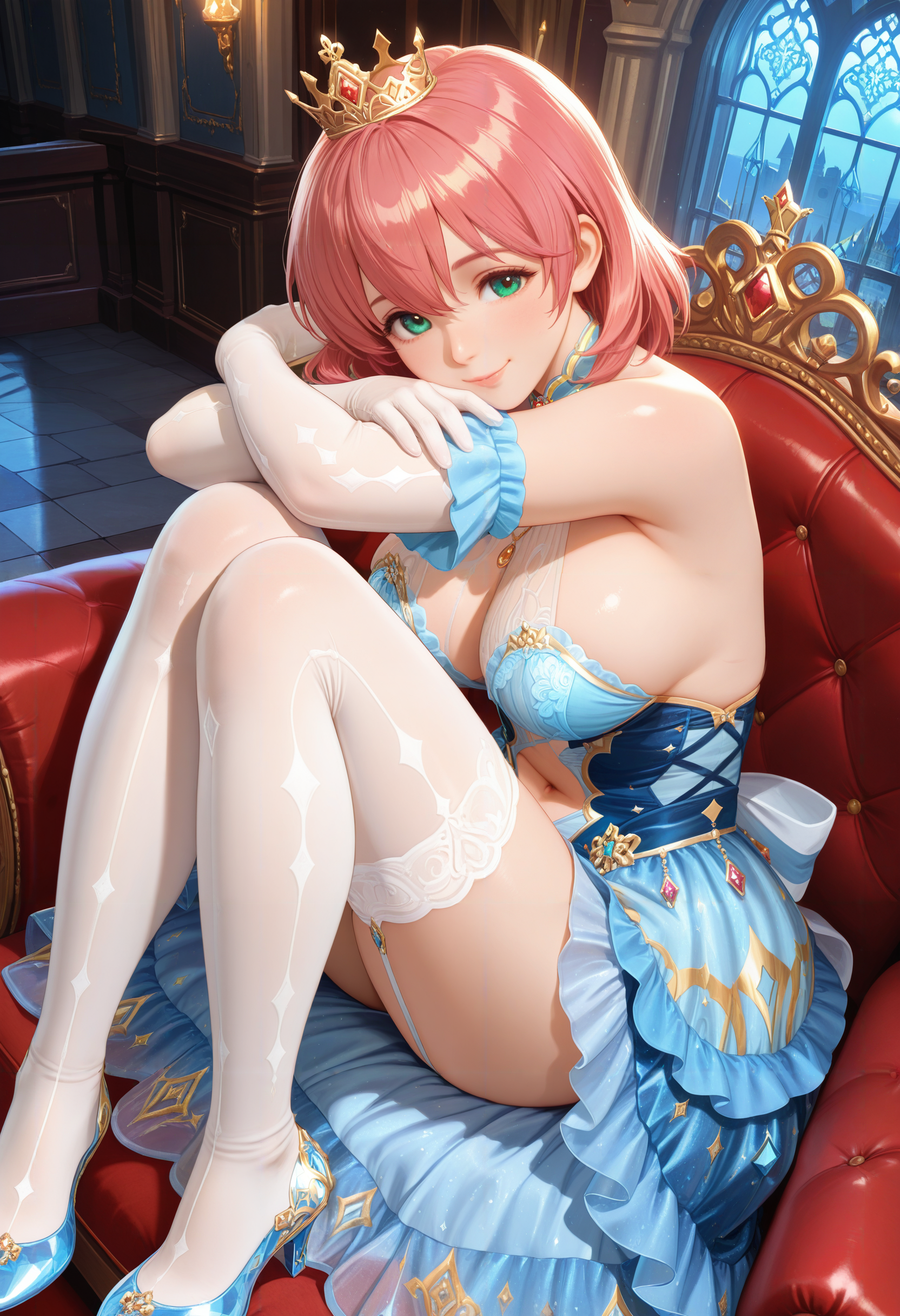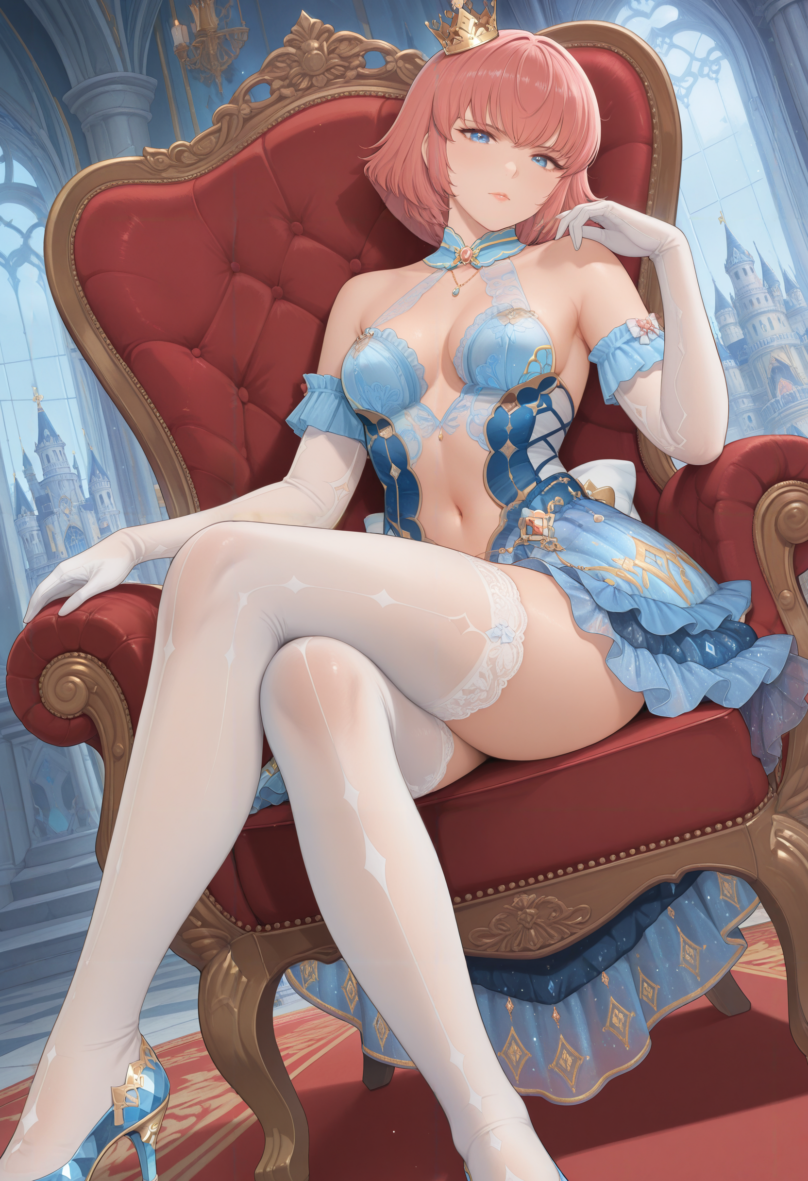 基本プロンプト:"CendrillonEscalier,crown,colset,navel cutout,elbow gloves,white panties,garter belt,white thighhighs"