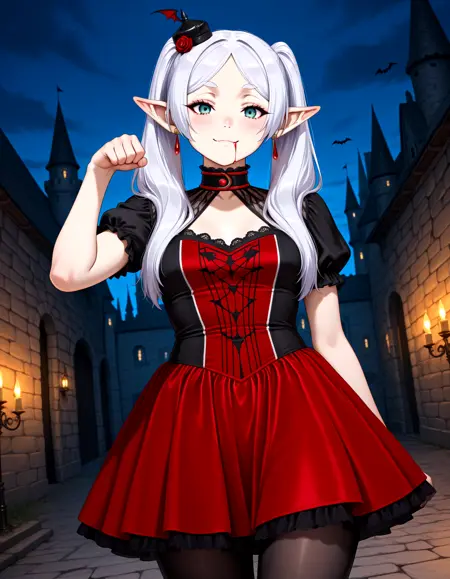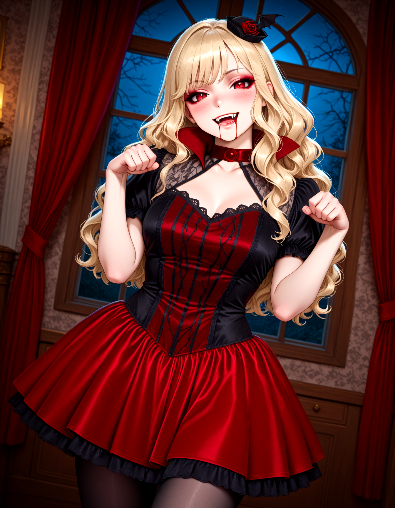 Vampire_Queen_Cos, red dress, black dress, two-tone corset, red skirt, lace-trimmed dress, lace, hair ornament, choker, lace trim, black pantyhose, puffy short sleeves, mini hat, high collar